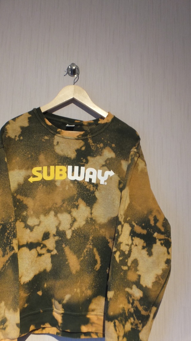 特殊加工済み完全一点物 アメリカ発のサンドウィッチチェーン SUBWAY サブウェイ 両面ロゴプリント入りスウェット サイズ表示M 日本サイズ概ね男女兼用Lサイズ以上相当 企業物古着 特殊加工古着