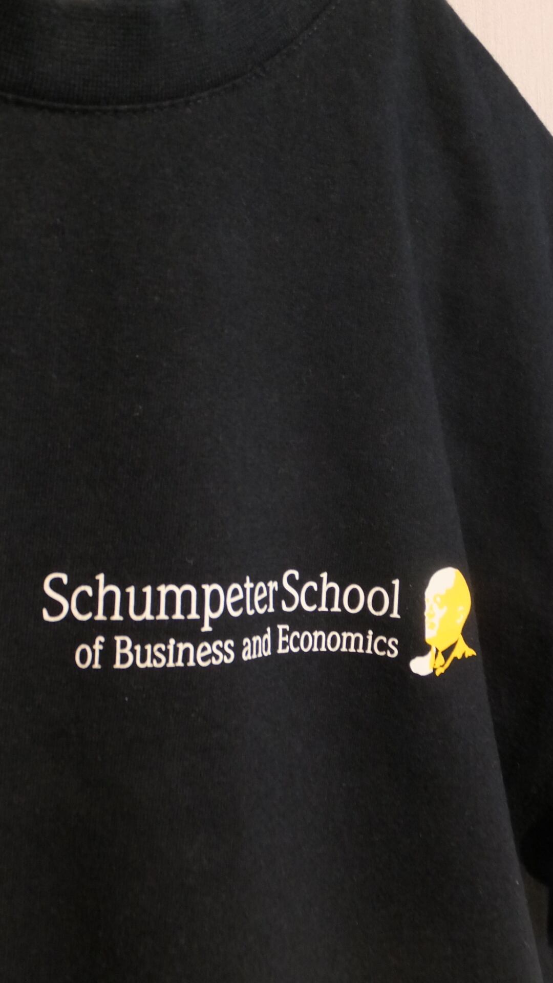 イノベーション理論等で20世紀の経済学を世界的に牽引した経済学者、ヨーゼフ・シュンペーター Joseph Schumpeter の名を冠したビジネススクール、Schumpeter School of Business and Economics シュンペータースクール・オブ・ビジネス・アンド・エコノミクス のプリントTシャツです。