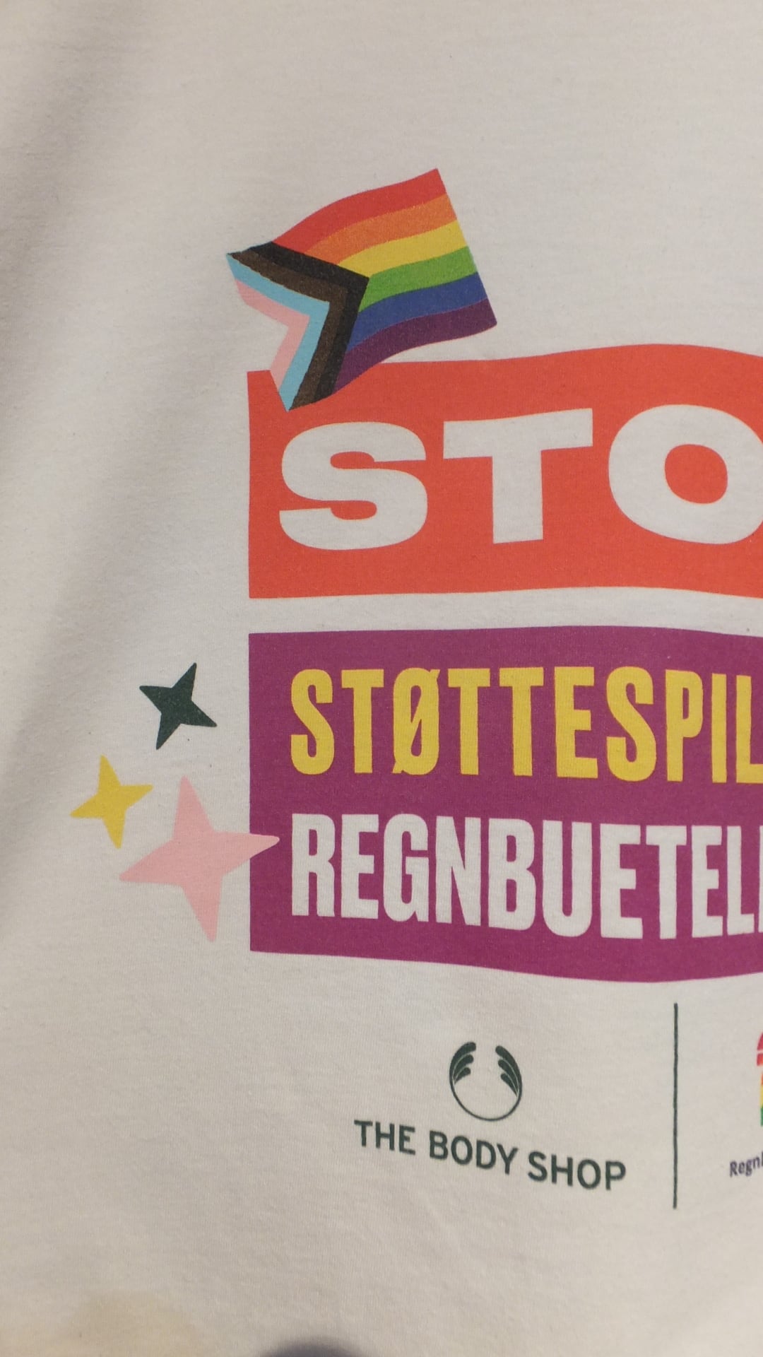 ノルウェー語のテキスト部分 STØTTESPILLER AV REGUNBUETELEFONEN は英語ですと、supporting actor of the rainbow phone となります。REGUNBUETELEFONEN はLGBTの方々やHIV患者の方々の社会的支援を主に電話で行うノルウェーの支援組織で、THE BODY SHOP が同団体を支援していることが窺えます。
