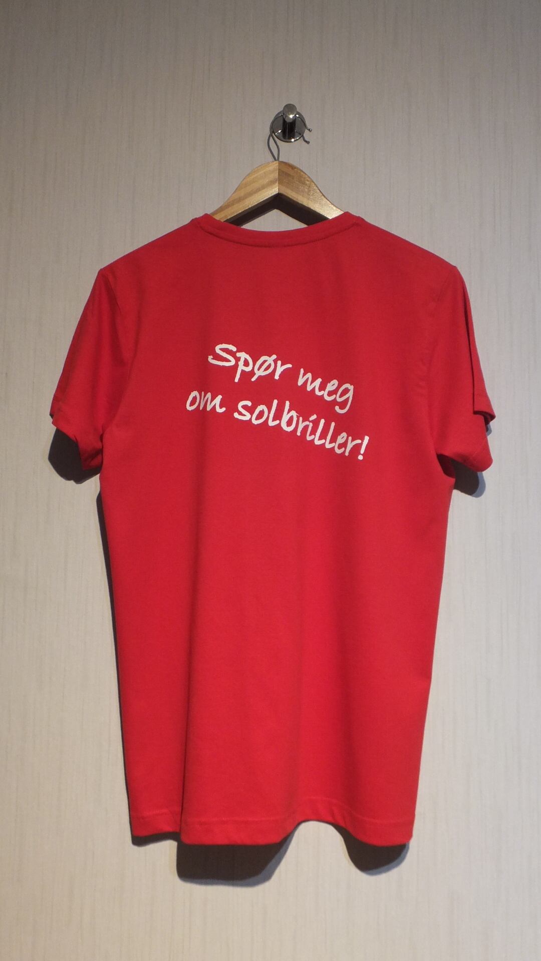 出荷時シール付き未使用新品 レイバン Ray-Ban ブランドロゴ、ノルウェー語テキスト(ask me about sunglasses)プリント入りTシャツ レッド 表示サイズM 日本サイズ概ねM以上相当(男女兼用サイズ基準)従業員用濃厚 企業物古着 | dankeman