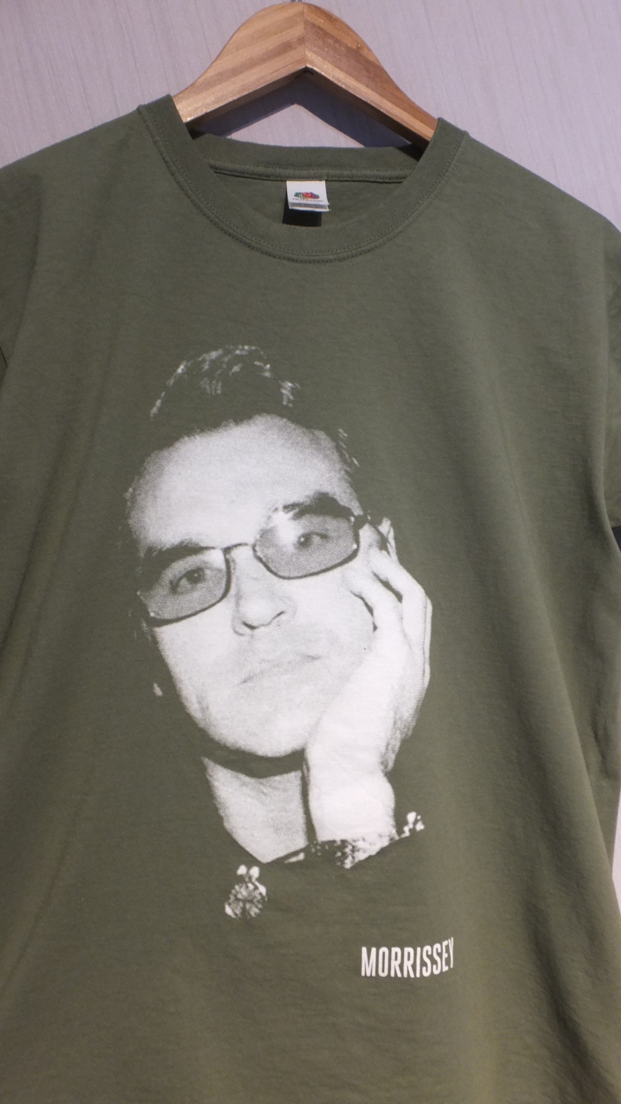 80年代のイギリスの音楽史上、最重要バンドの一つであるザ・スミスのボーカル、モリッシーの顔がプリントされたTシャツです。詳細不明。