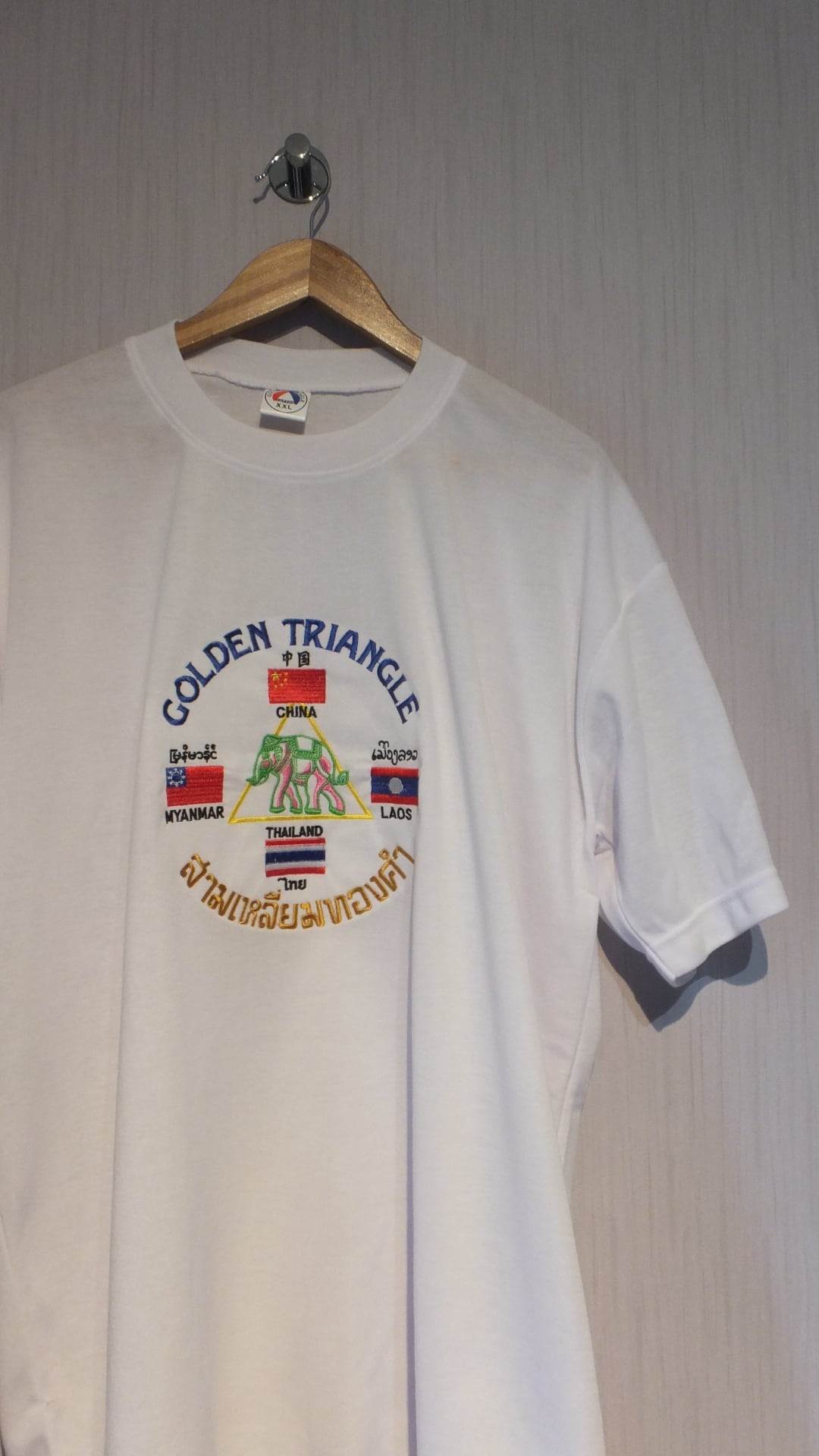 麻薬密造地帯としてその不穏さで名高い、タイ、ミャンマー、ラオスの3か国に跨る、ゴールデントライアングルの刺繍入りTシャツ。中国も入っているのは詳細不明ですが、関与度によるものでしょうか。おそらく土産物の類。