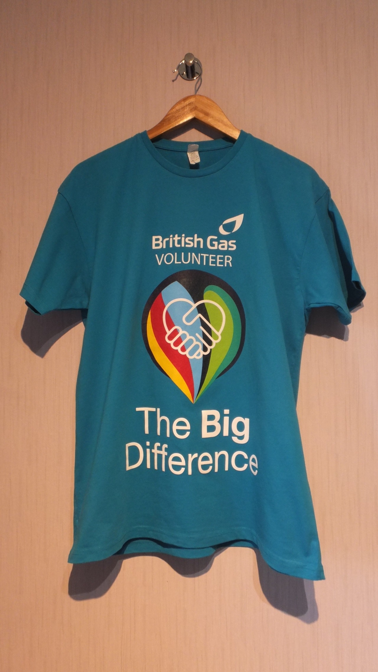 出荷時シール付き未使用新品 イギリスのガス(および電力も)供給会社 ブリティッシュガス British Gas 会社主催のボランティア活動参加者用会社ロゴプリント入りTシャツ ブルー 表示サイズL 日本サイズ概ねL相当(男女兼用サイズ基準、肩幅若干広め)企業物古着 | dankeman