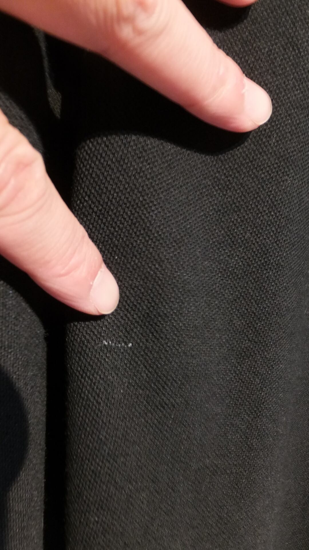 写真10および11枚目は、おそらく生地製造の段階で長さ4mm程度の白い糸が混入したと見られる部分を示しております。