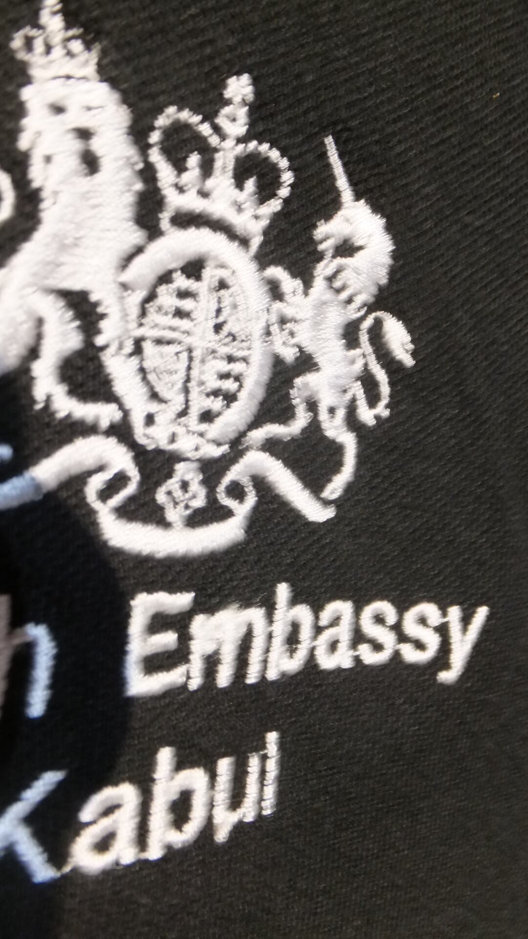 British Embassy のうち、アルファベット "m" 部分の刺繍が若干つぶれております。