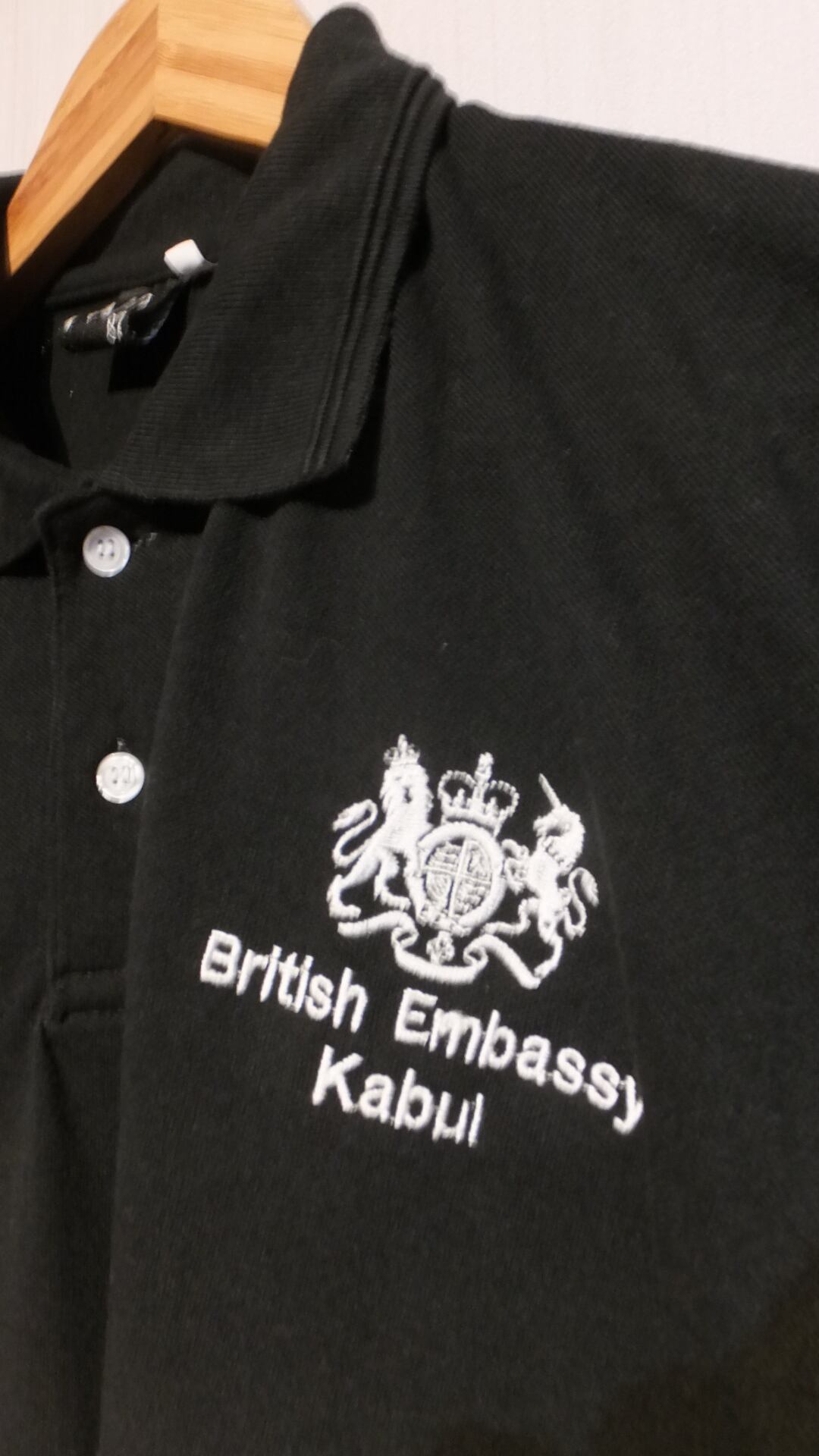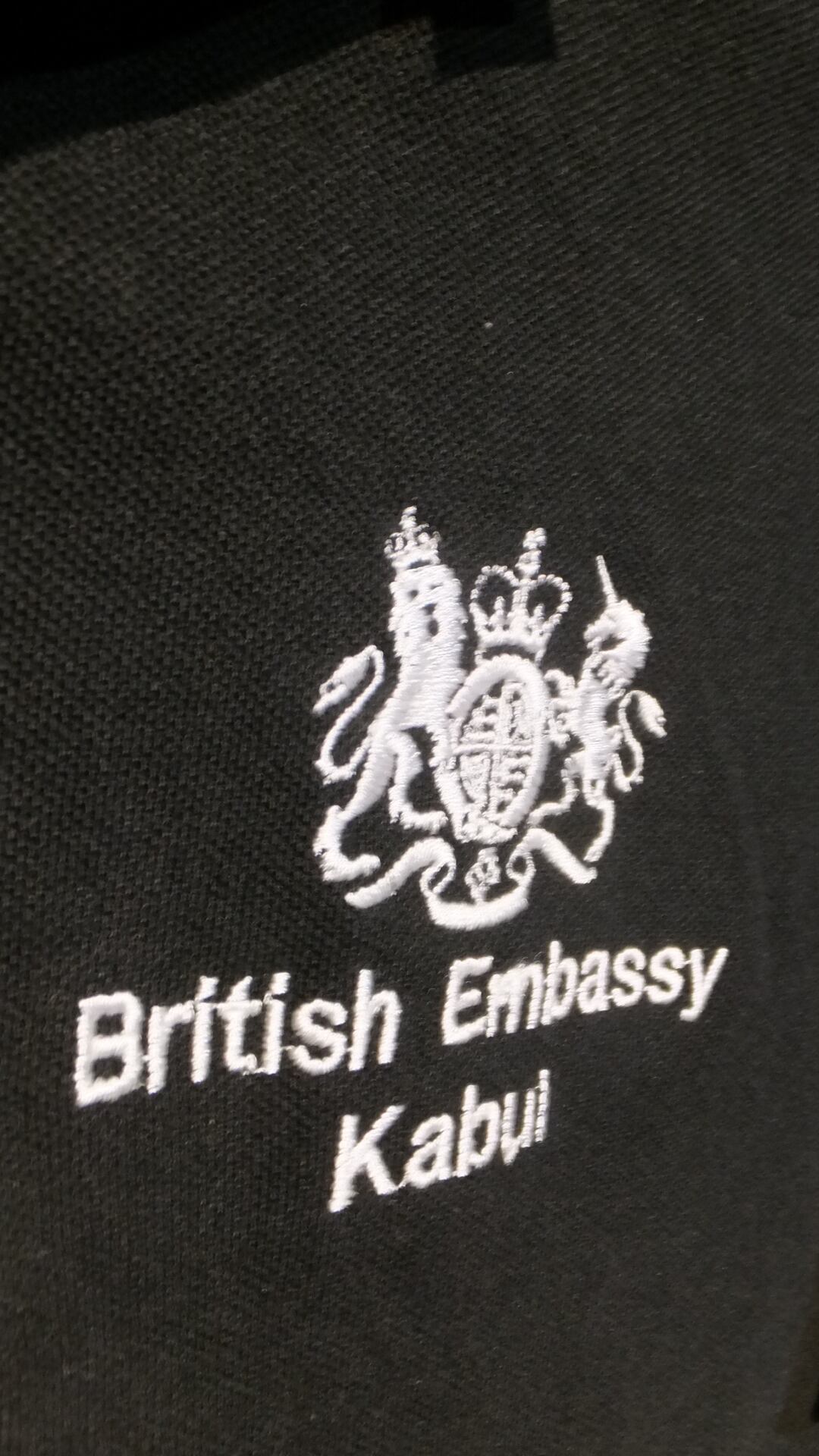タリバンが政権を奪取した2021年8月以降、事実上の閉鎖状態にある、アフガニスタンの首都カブールにあるイギリス大使館のロゴ入りポロシャツです。