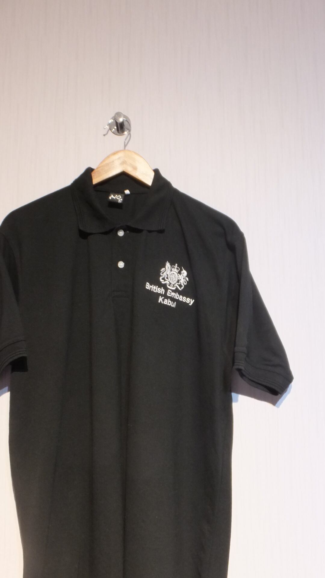 在カブール(アフガニスタンの首都)イギリス大使館(2021年8月以降閉鎖状態)組織刺繍入り半袖ポロシャツ 日本基準概ねXL以上相当(男女兼用サイズ基準)ブラック 表示サイズXXL 国家系古着 | dankeman