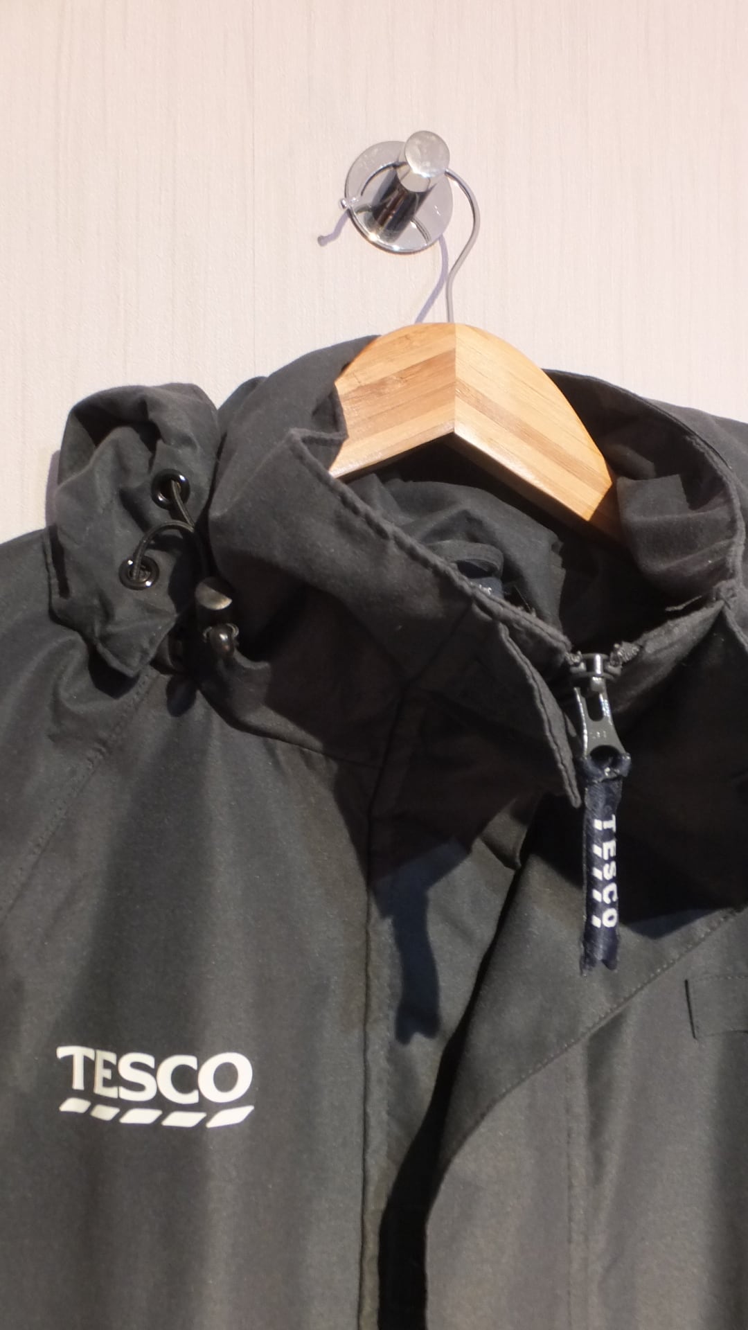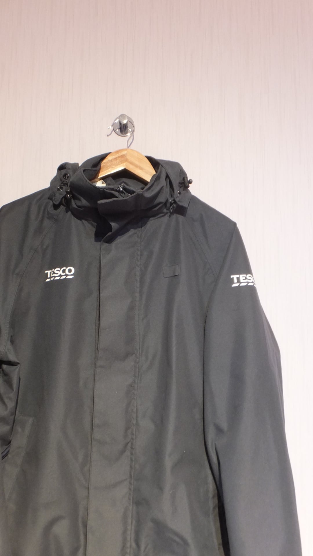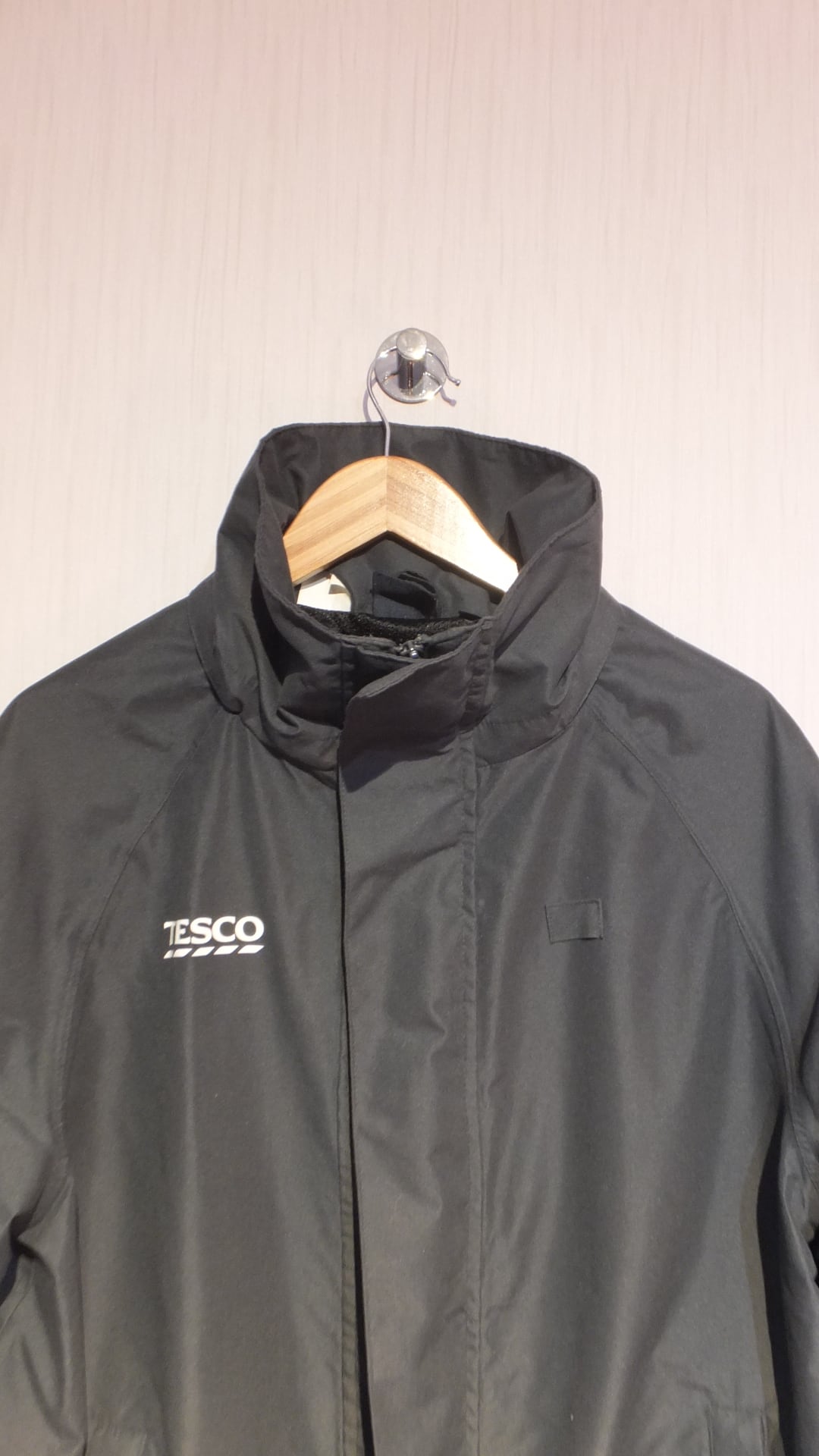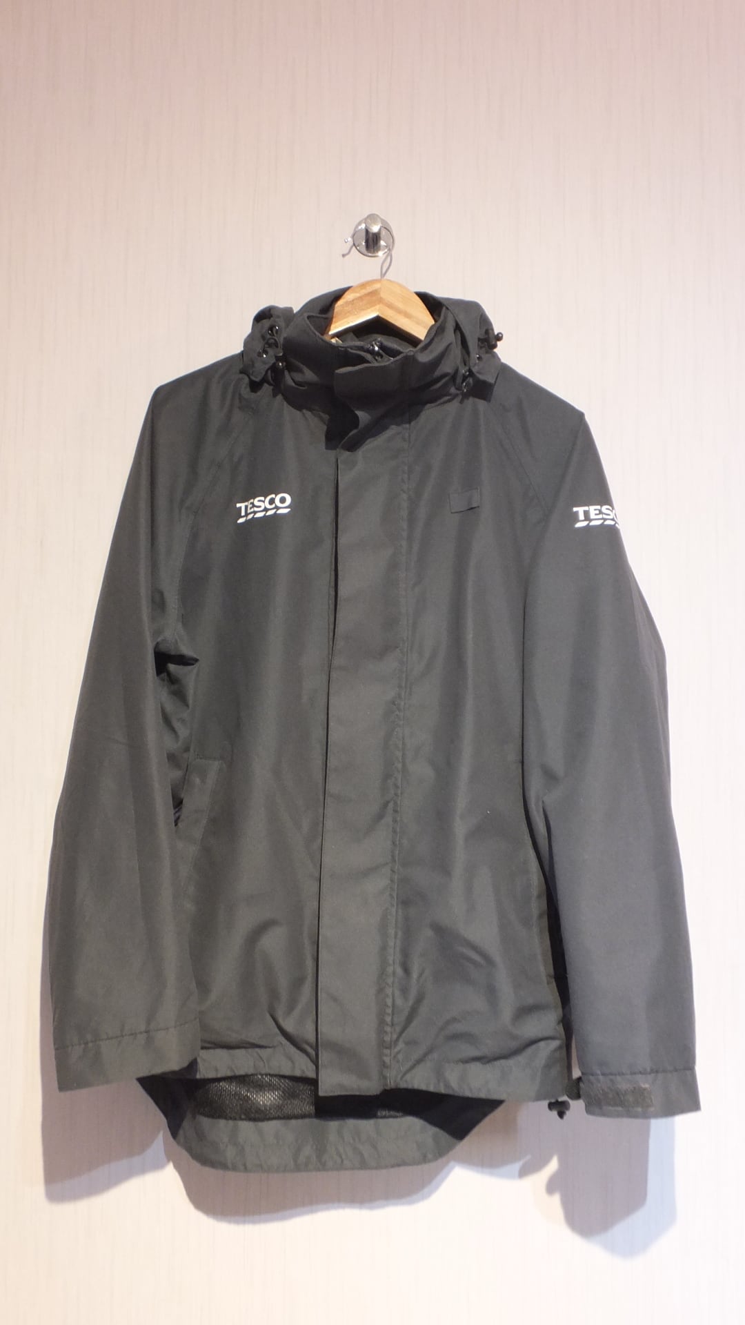 イギリスのスーパーマーケットチェーン TESCO テスコ 従業員用ジャケット ロゴプリント2か所入り フード着脱/収納可 ブラック 表示サイズM 日本基準サイズ概ねメンズL相当 企業物古着 | dankeman