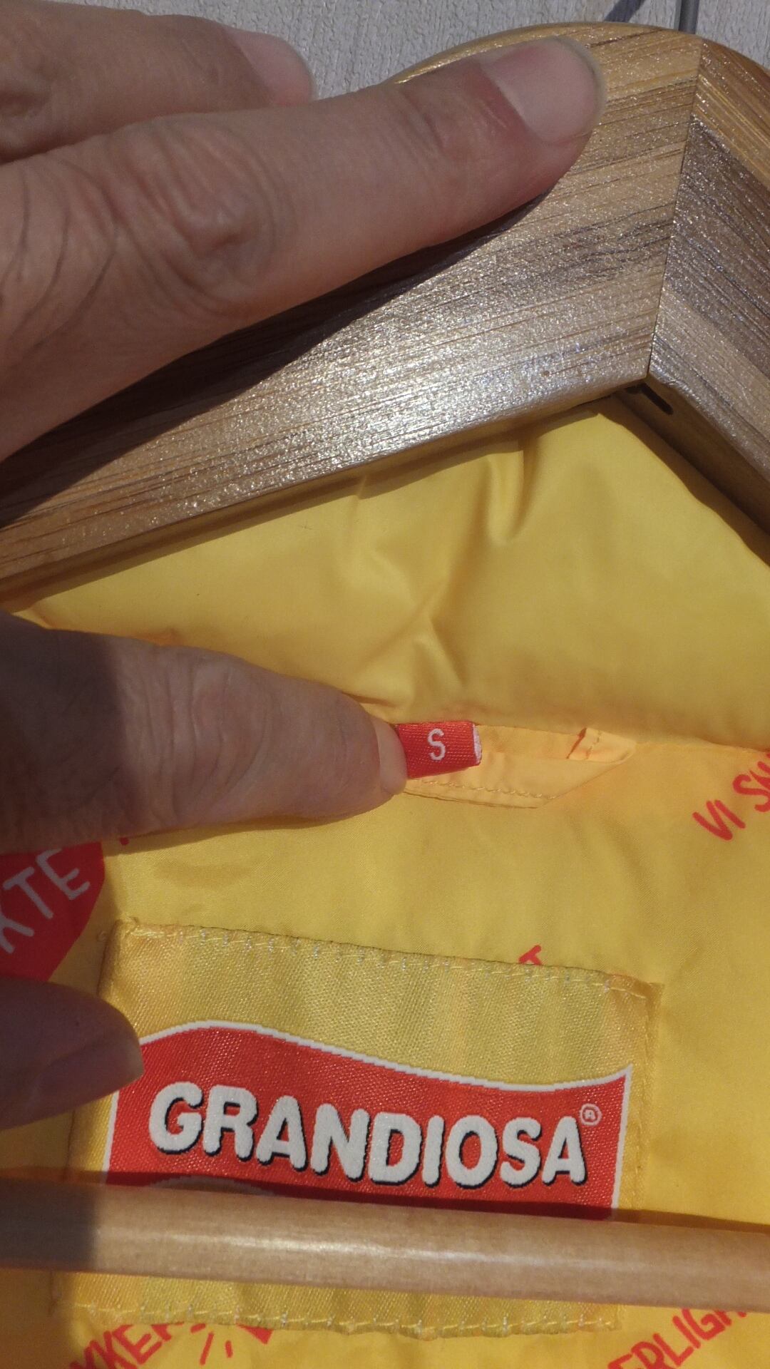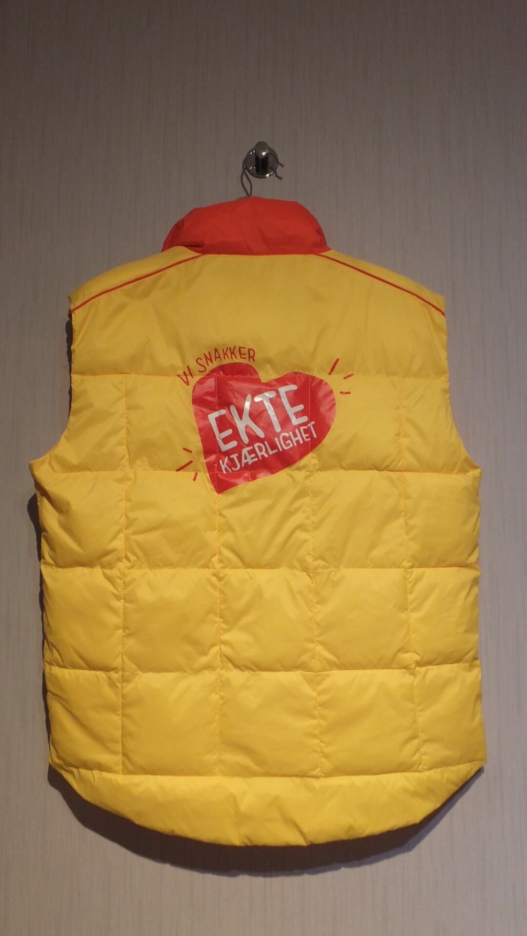 ほぼ未使用美品 ノルウェー国内トップシェアピザブランド(スーパーなどで売っている冷凍タイプのピザ)GRANDIOSA ロゴプリント入り中綿ベスト おそらく関係者用 イエロー 日本基準概ね男女兼用L相当 サイズ表示S 作業着 企業物古着 | dankeman