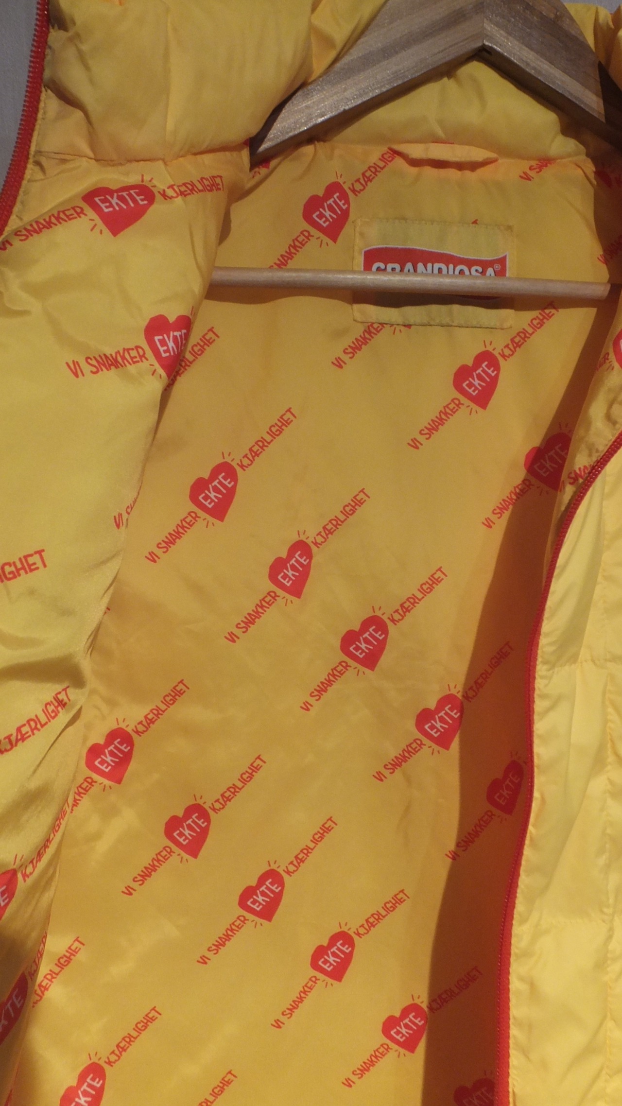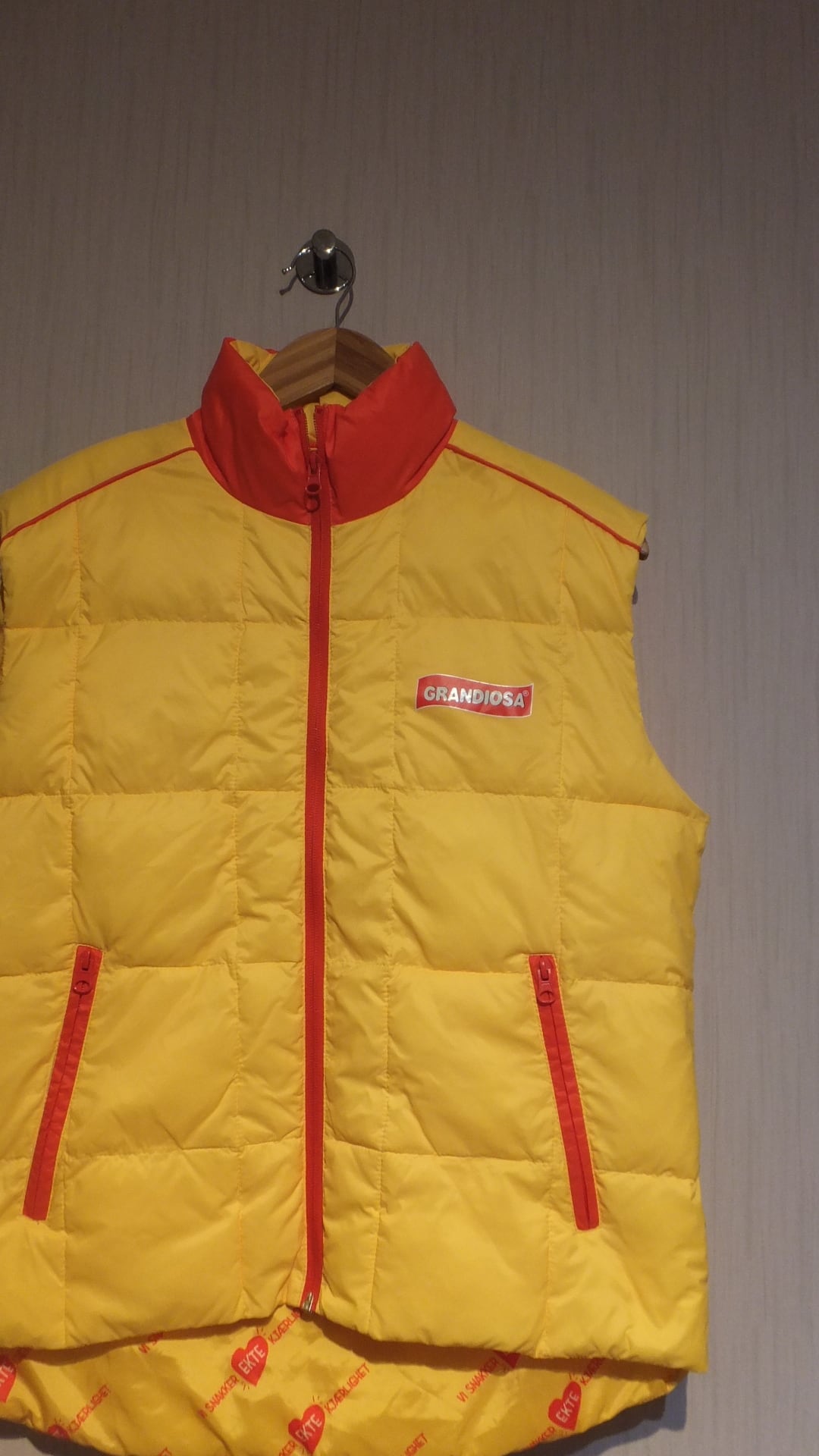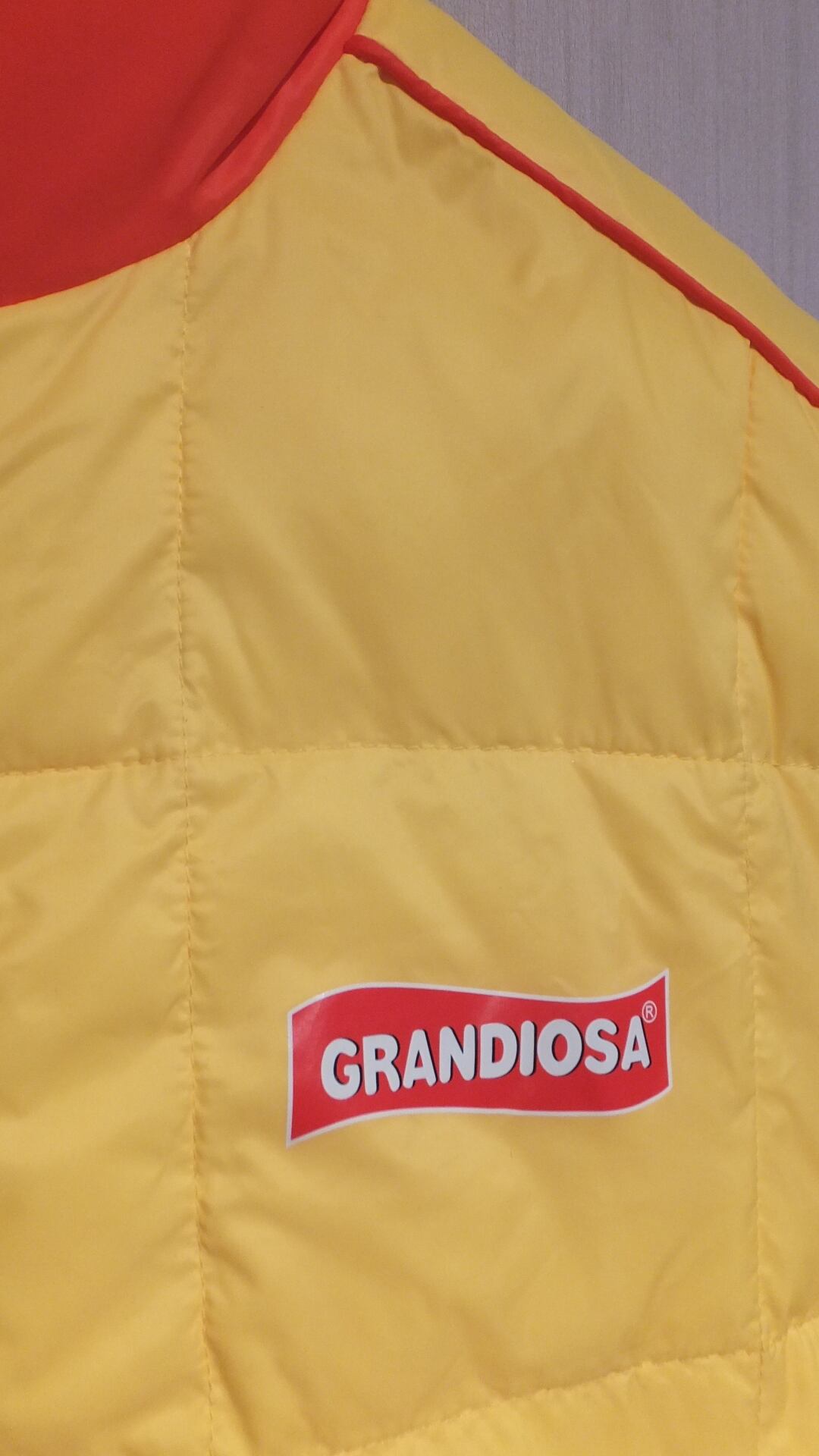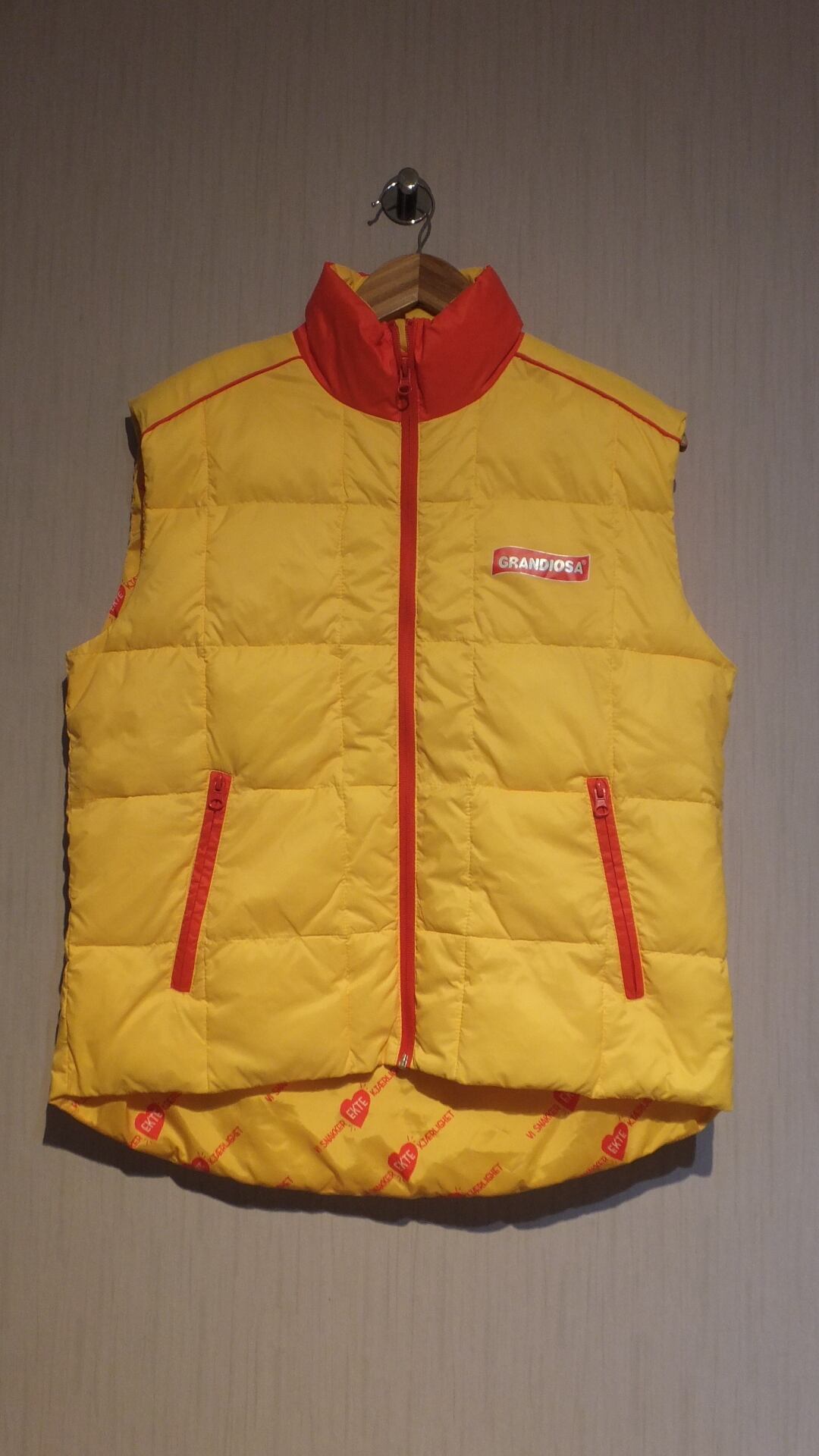 1980年にノルウェーにて操業開始、ノルウェーではトップシェアの冷凍ピザ、GRANDIOSA のロゴ入り中綿ベストです。現在は北欧と中欧あたりが主な商圏。