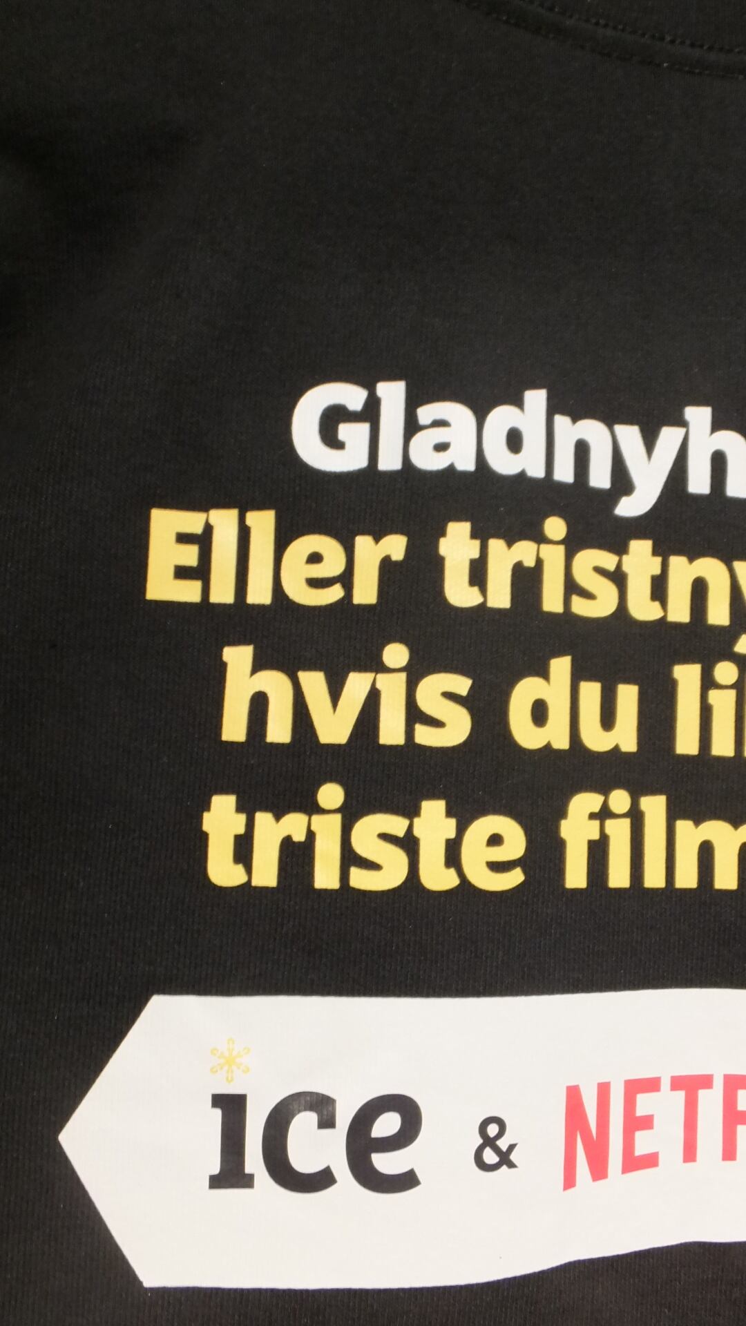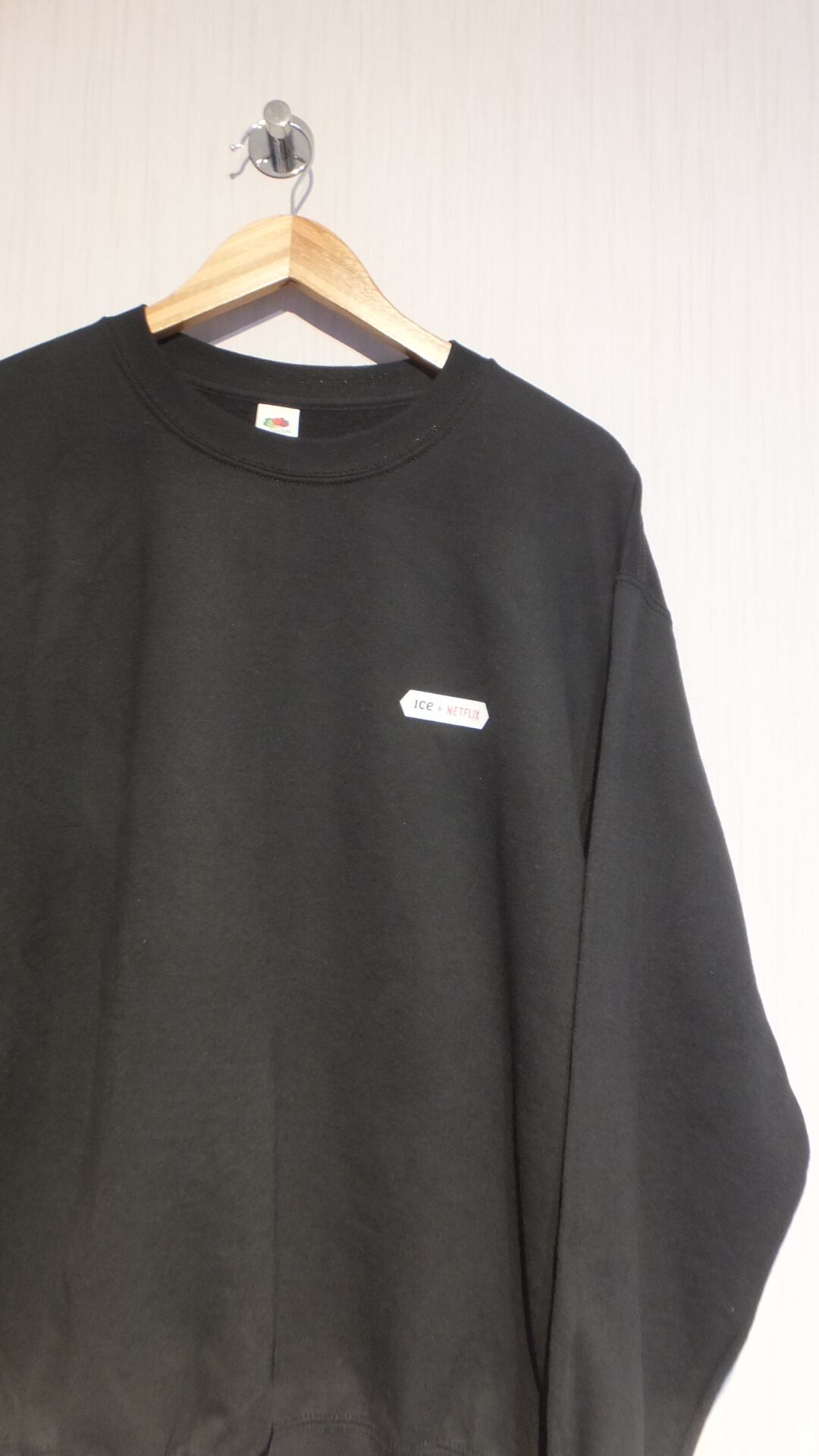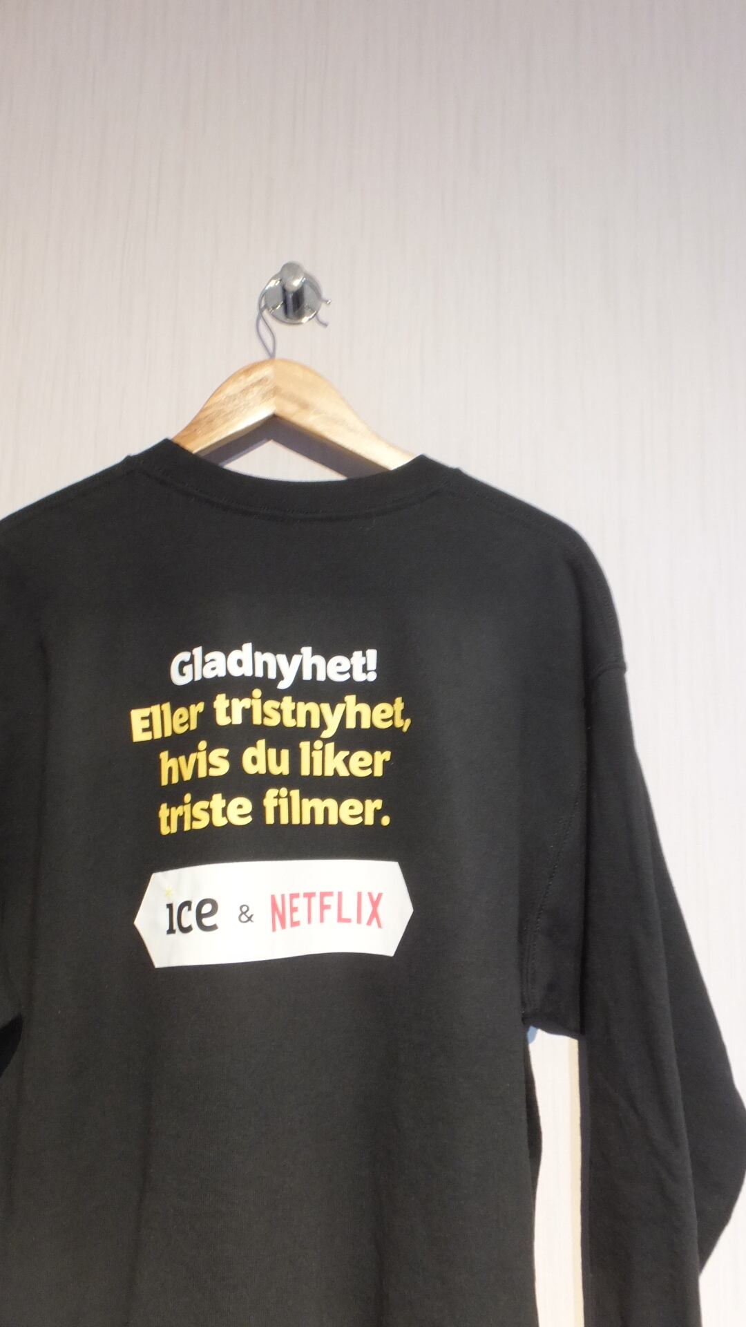 出荷時シール付き未使用新品 NETFLIXとノルウェーの通信業者 ice 両社ロゴプリント両面、およびノルウェー語での広告テクストプリント入りスウェット 日本基準概ねL以上相当(男女兼用サイズ)表示サイズL ブラック 企業物古着 ※写真1枚目はバックプリントです | dankeman