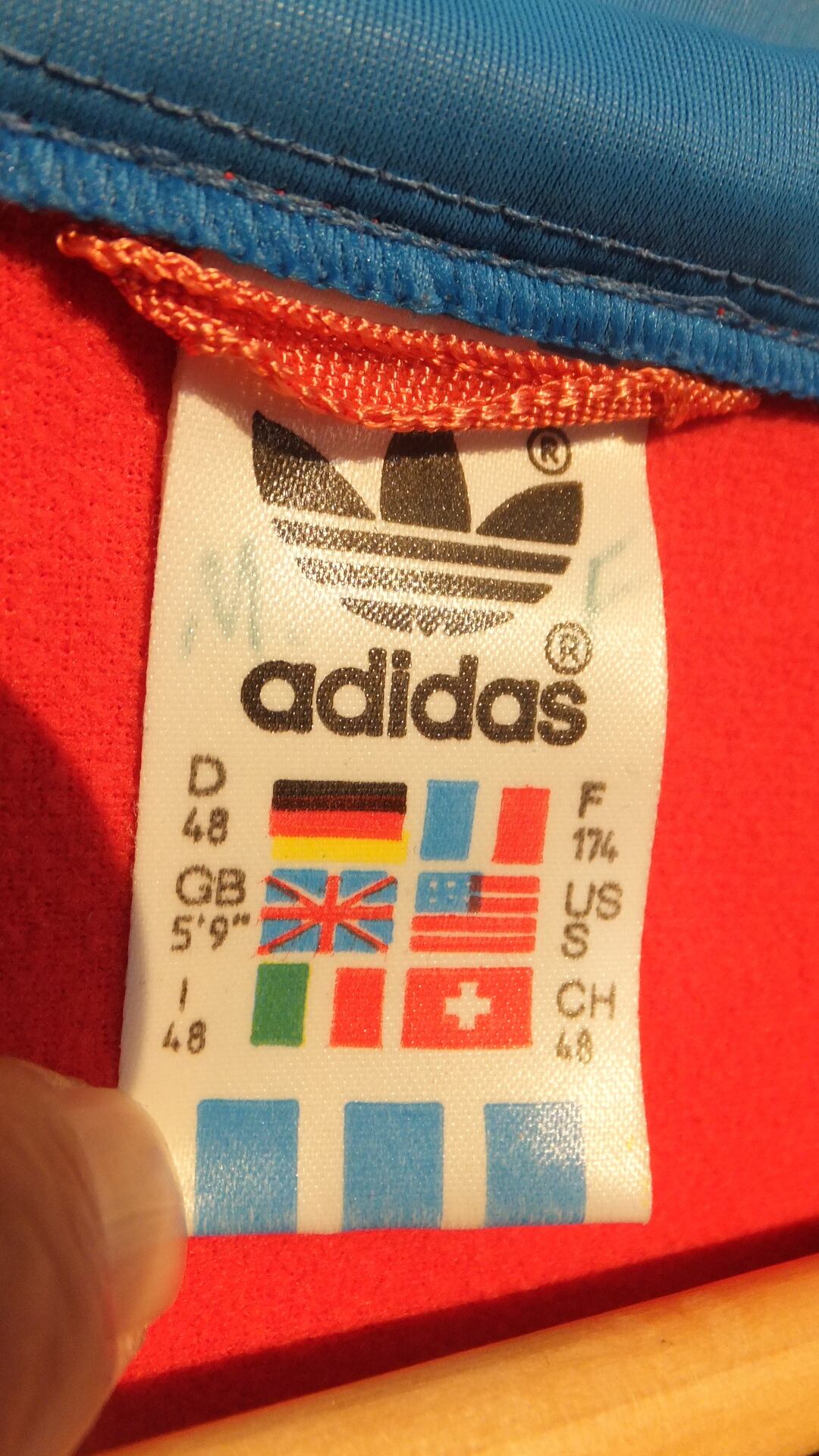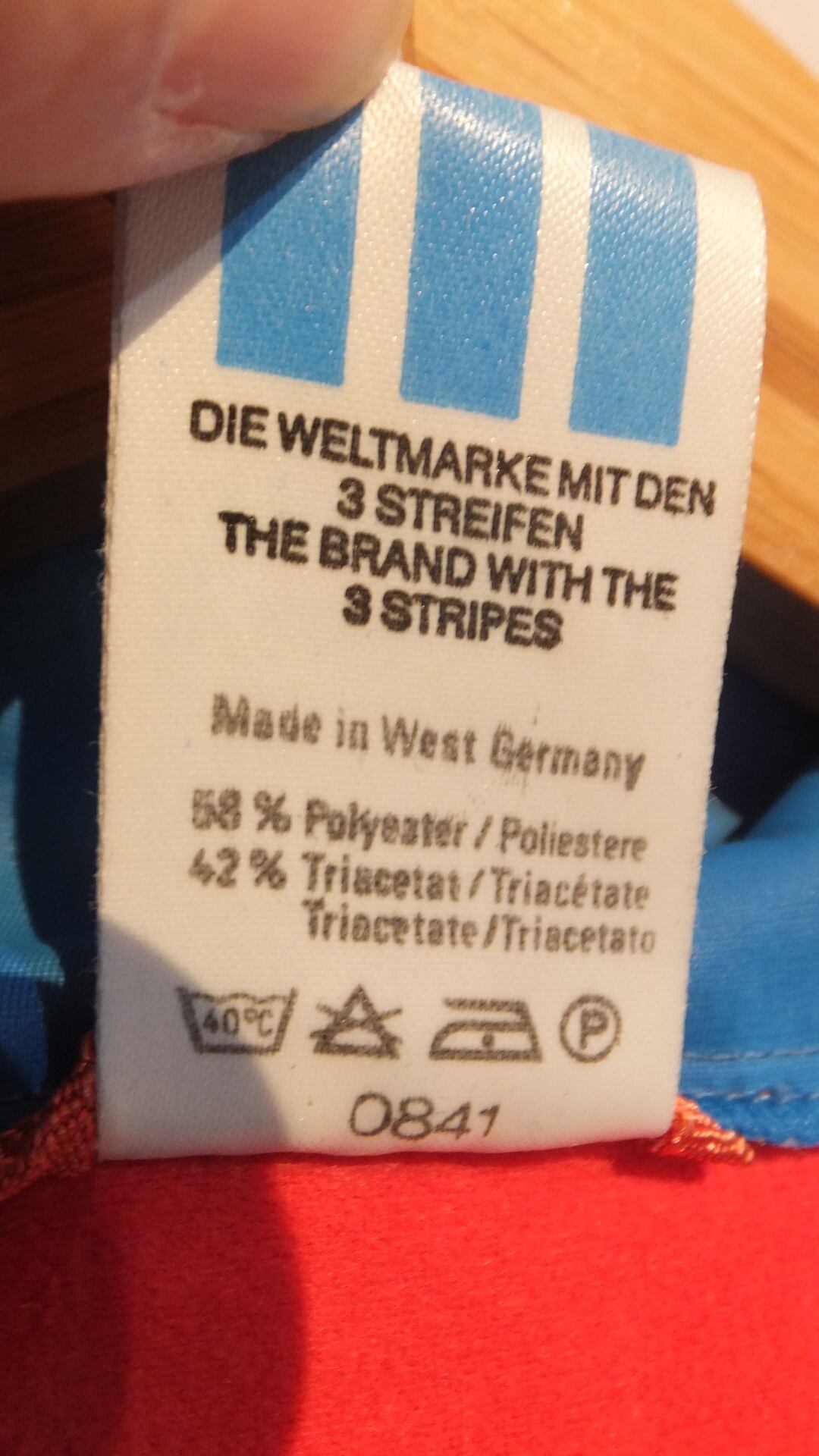 西ドイツ製の表記があるため1990年以前製確定のアディダスのジャージです。万国旗タグ。