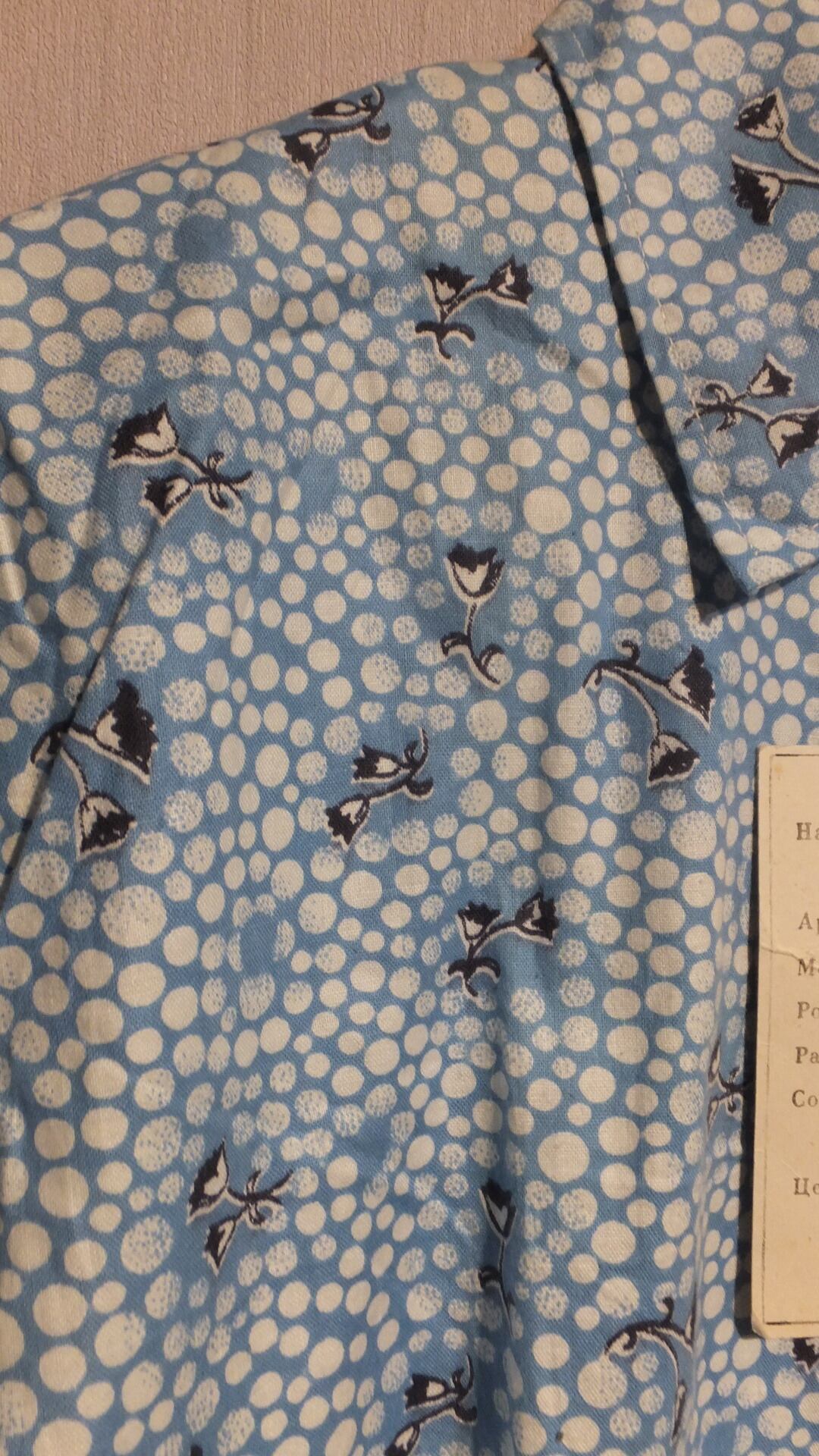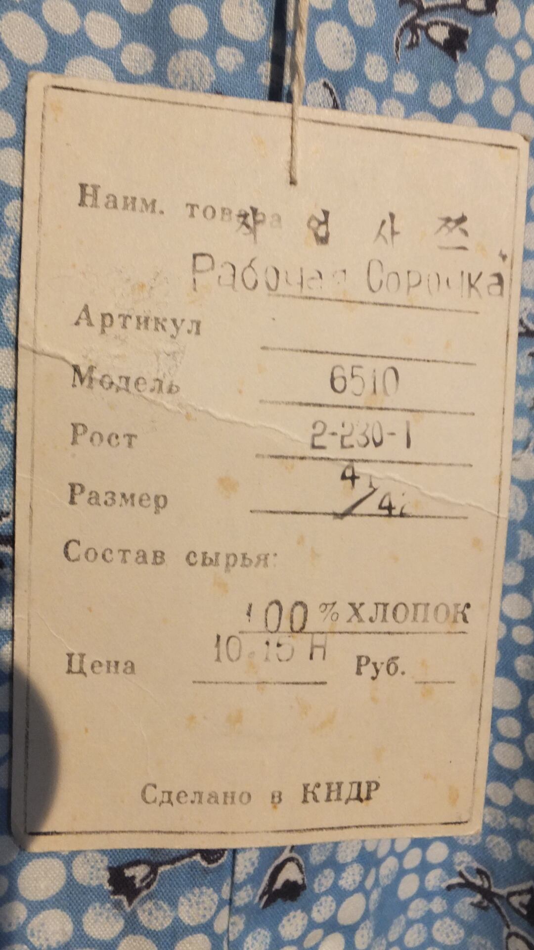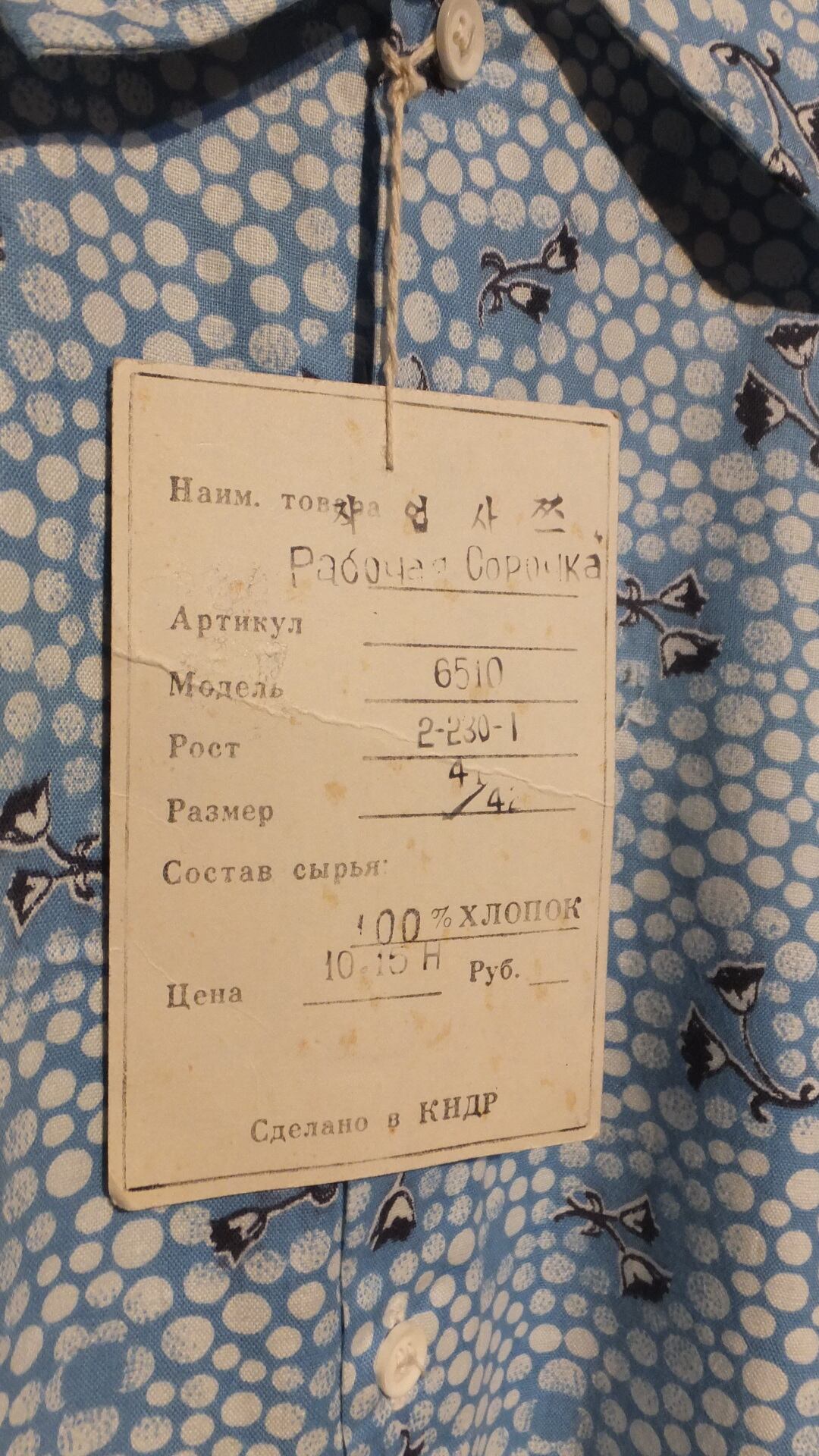 ロシア語/ハングル文字表記のタグ付き未使用品 1960年代前半製造(1961~1965年が濃厚)、北朝鮮製(製造国確定)ソビエト連邦向け労働者用長袖シャツ コットン100% 日本基準概ね男女兼用M相当(身幅、肩幅基準で)着丈若干長め ライトブルー/水玉 表示サイズ41(当時のソビエト規格で身長およそ 158〜164 cm 向け)プレミア古着 | dankeman