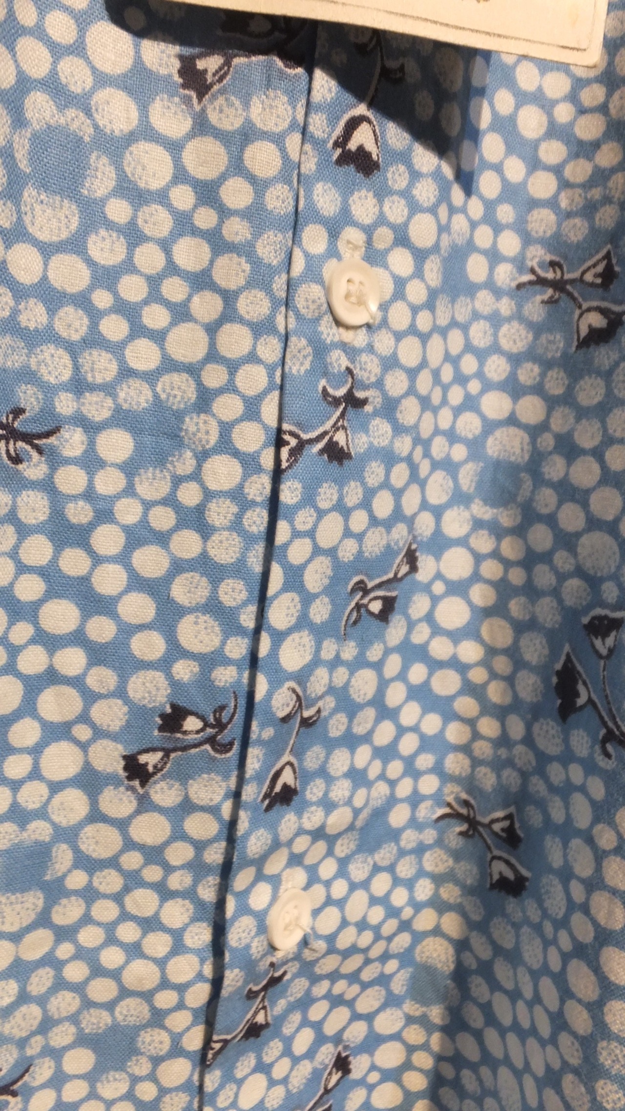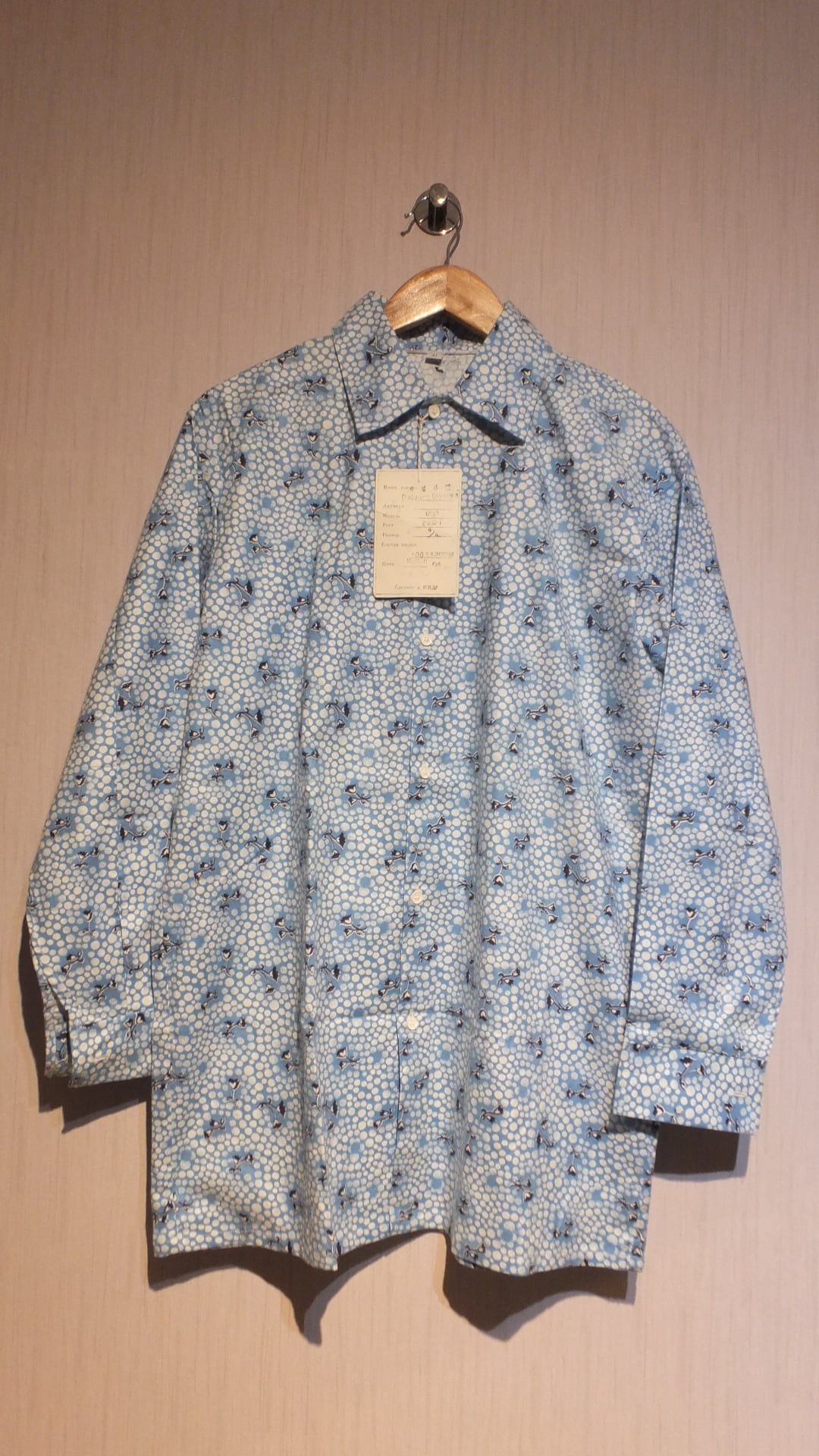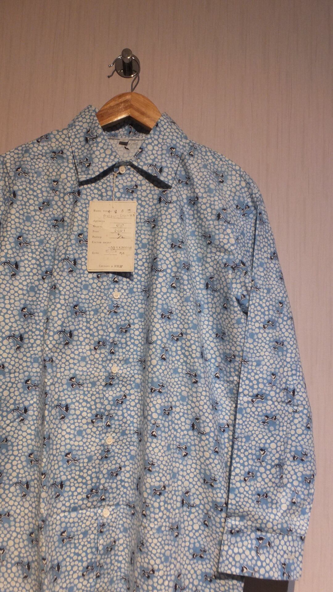 ロシア語/ハングル文字表記のタグ付き未使用品 1960年代前半製造(1961~1965年が濃厚)、北朝鮮製(製造国確定)ソビエト連邦向け労働者用長袖シャツ コットン100% 日本基準概ね男女兼用M相当(身幅、肩幅基準で)着丈若干長め ライトブルー/水玉 表示サイズ41(当時のソビエト規格で身長およそ 158〜164 cm 向け)プレミア古着 | dankeman