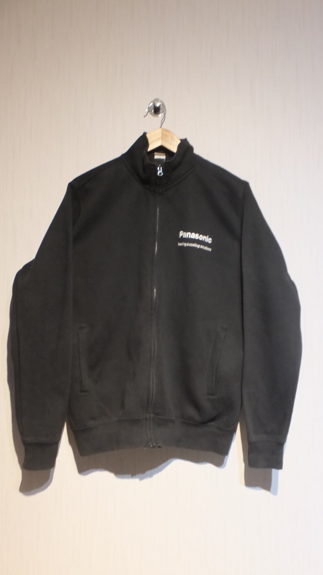 Panasonic パナソニック ブランドロゴおよび heating & cooling solutions (同社の空調・暖房事業関連部門におけるキャッチコピー)刺繍入りスウェット 日本基準概ねM以上相当(男女兼用サイズ)表示サイズM ブラック 企業物古着 | dankeman