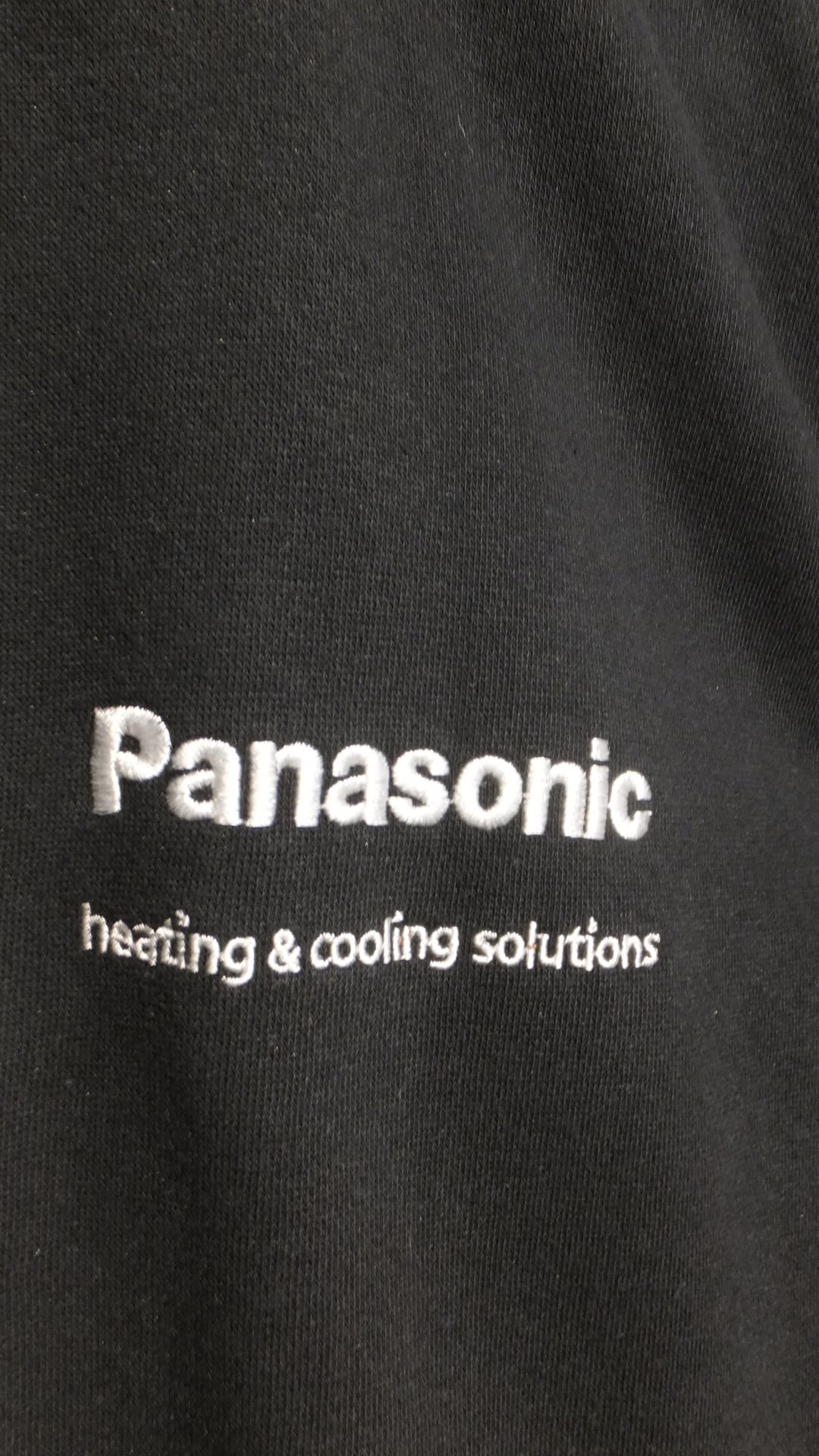 日本が世界に誇るブランドの一つである、パナソニック Panasonic のブランドロゴと、同社の空調・暖房事業関連部門におけるキャッチコピーのようなフレーズ、heating & cooling solutions という文言が刺繍されたスウェットです。