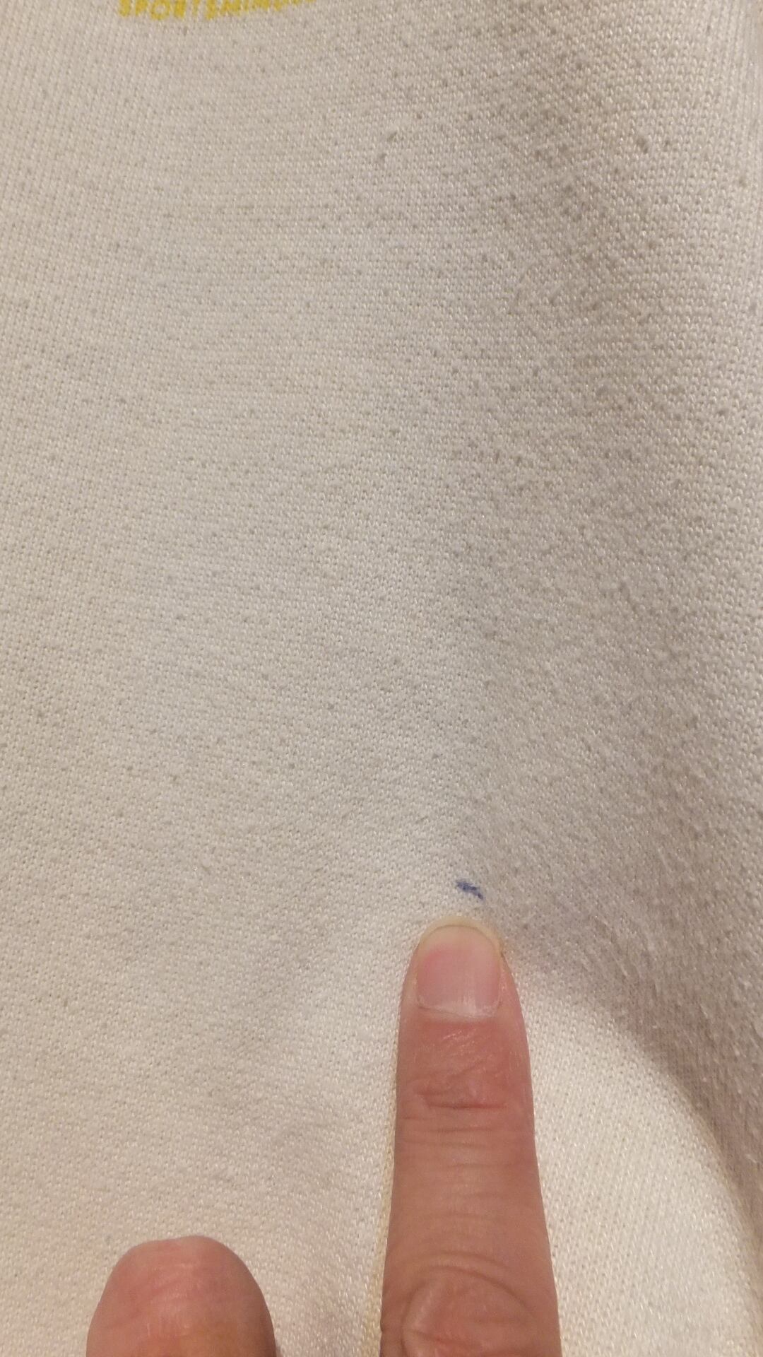 写真10~11枚目は、おそらく生地製造時に混入したのではないかと見られる灰色の繊維を示しております。汚れではありません。