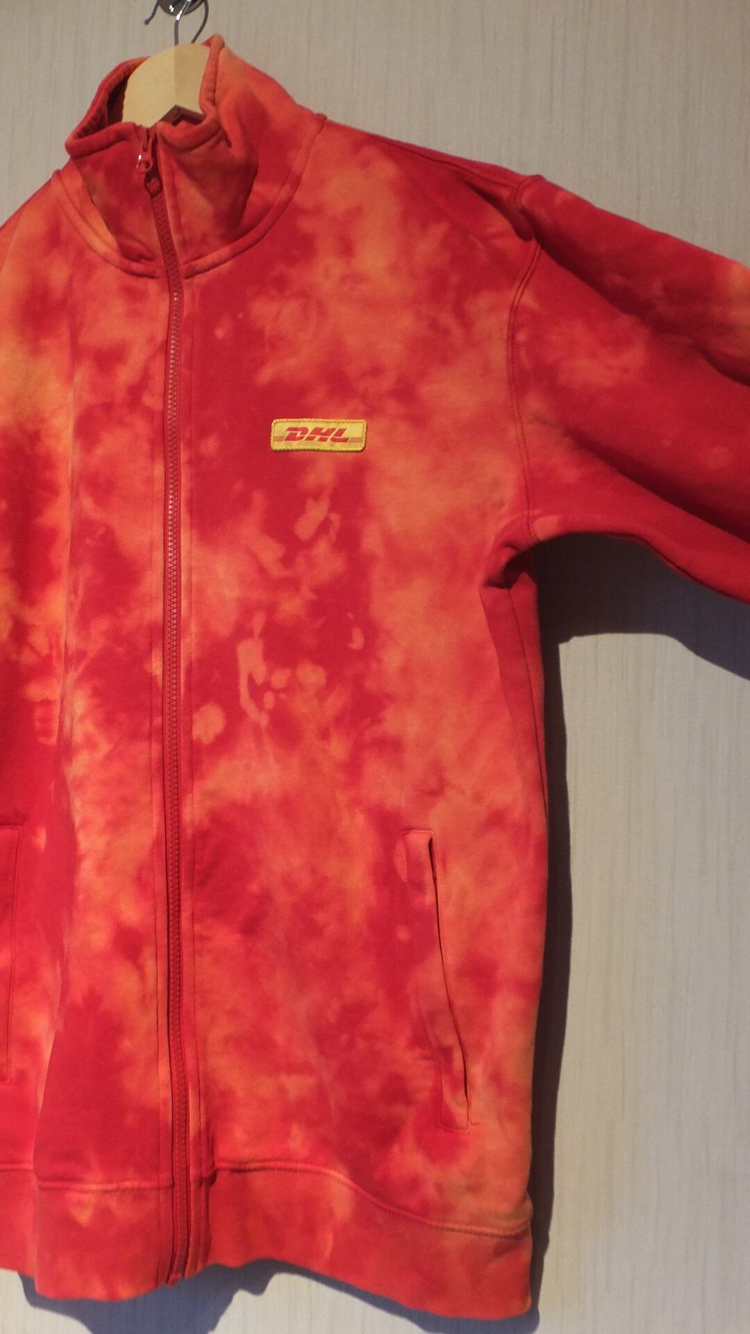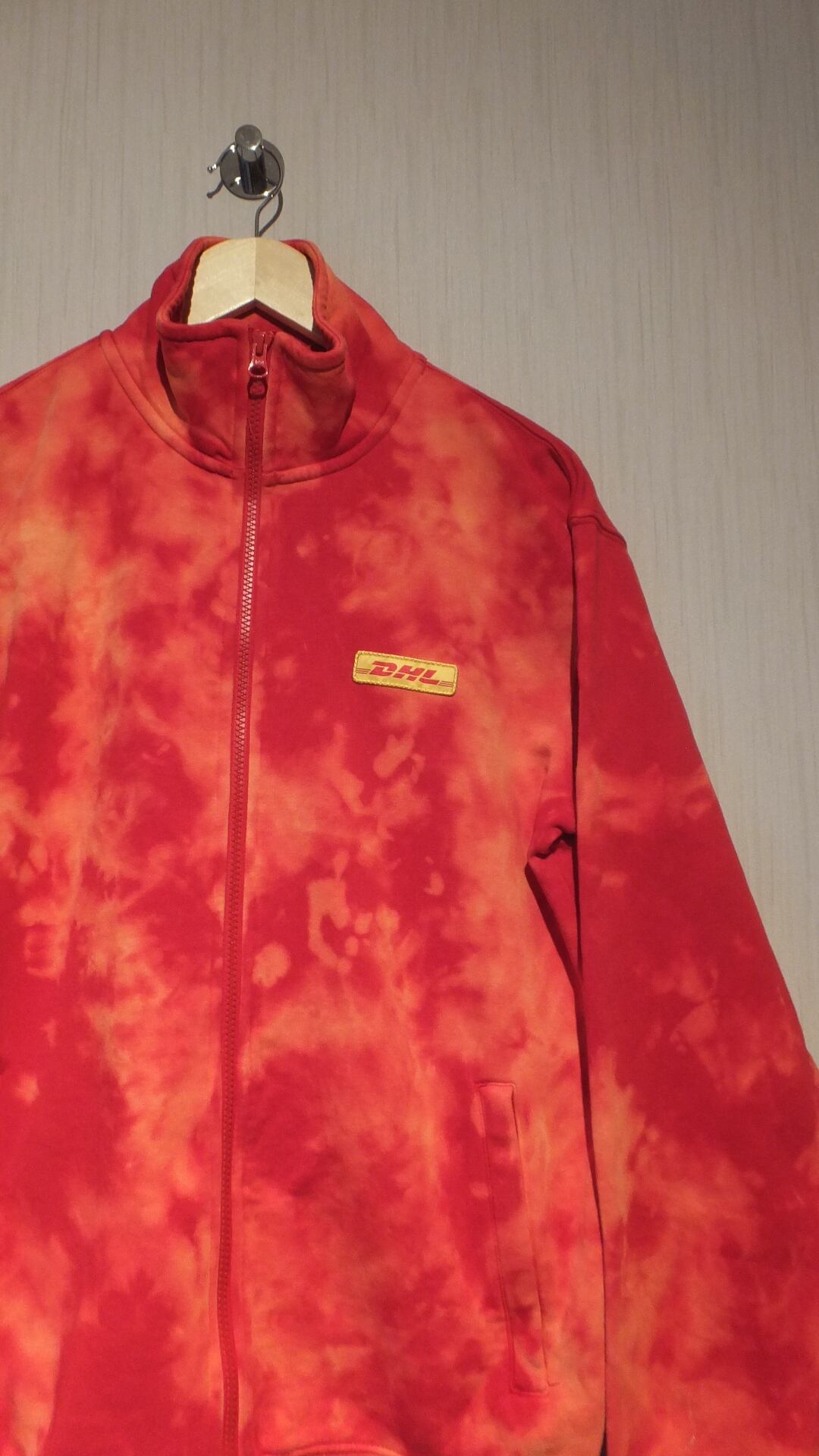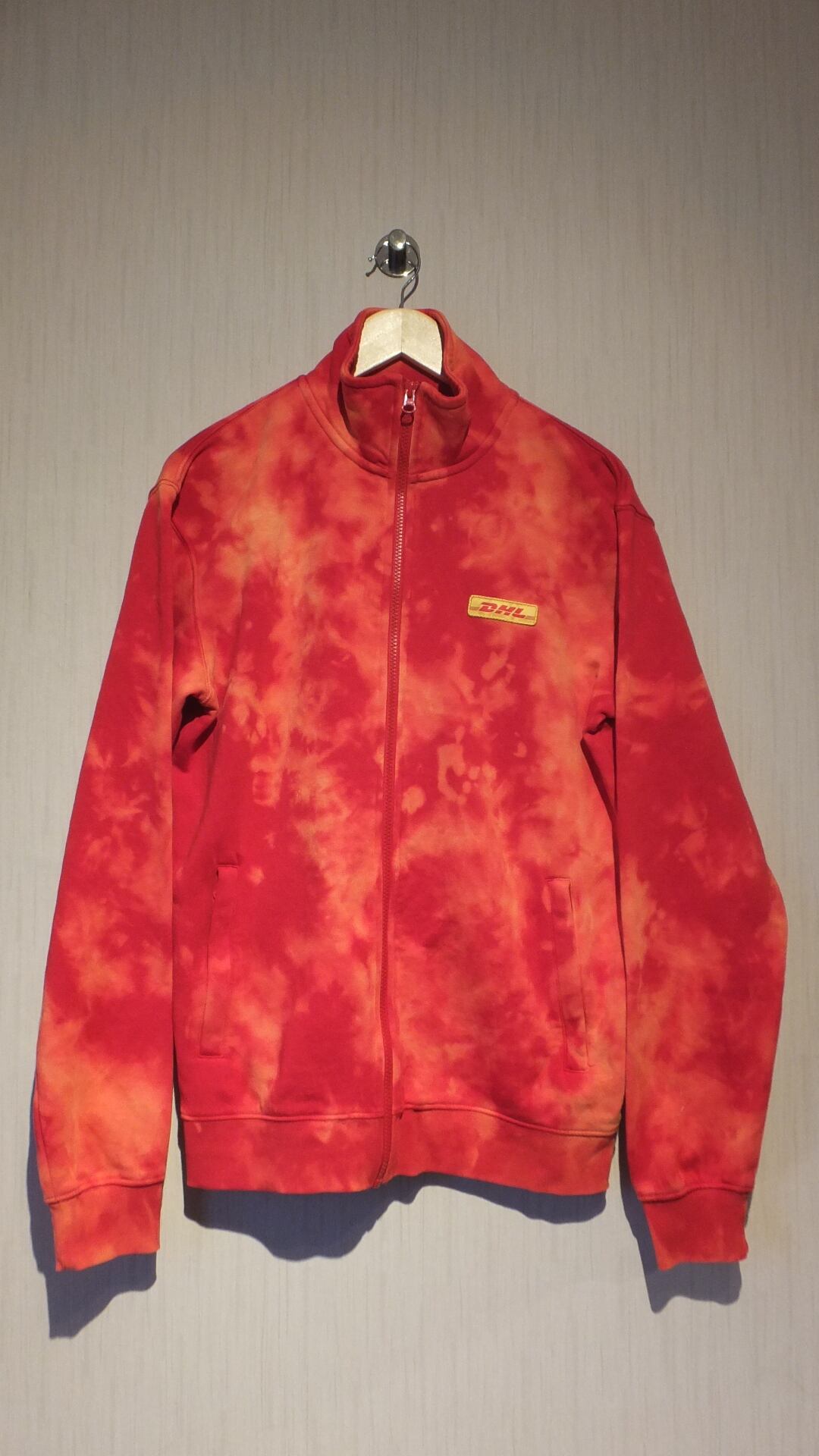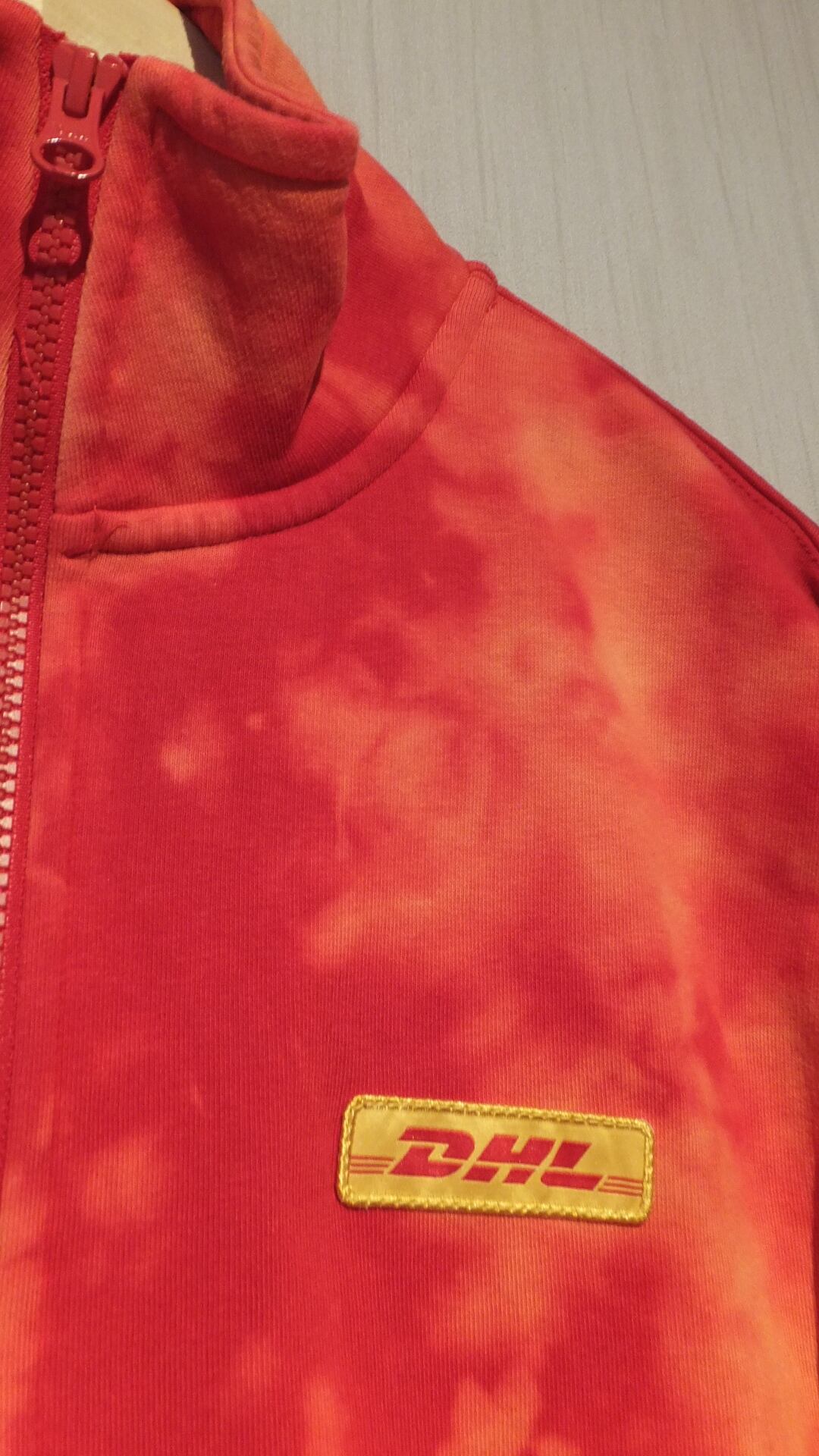 ドイツが世界に誇る物流業者、DHL ディーエイチエル の刺繍ロゴ入りフルジップスウェットです。おそらく従業員用ではないかと見られます。