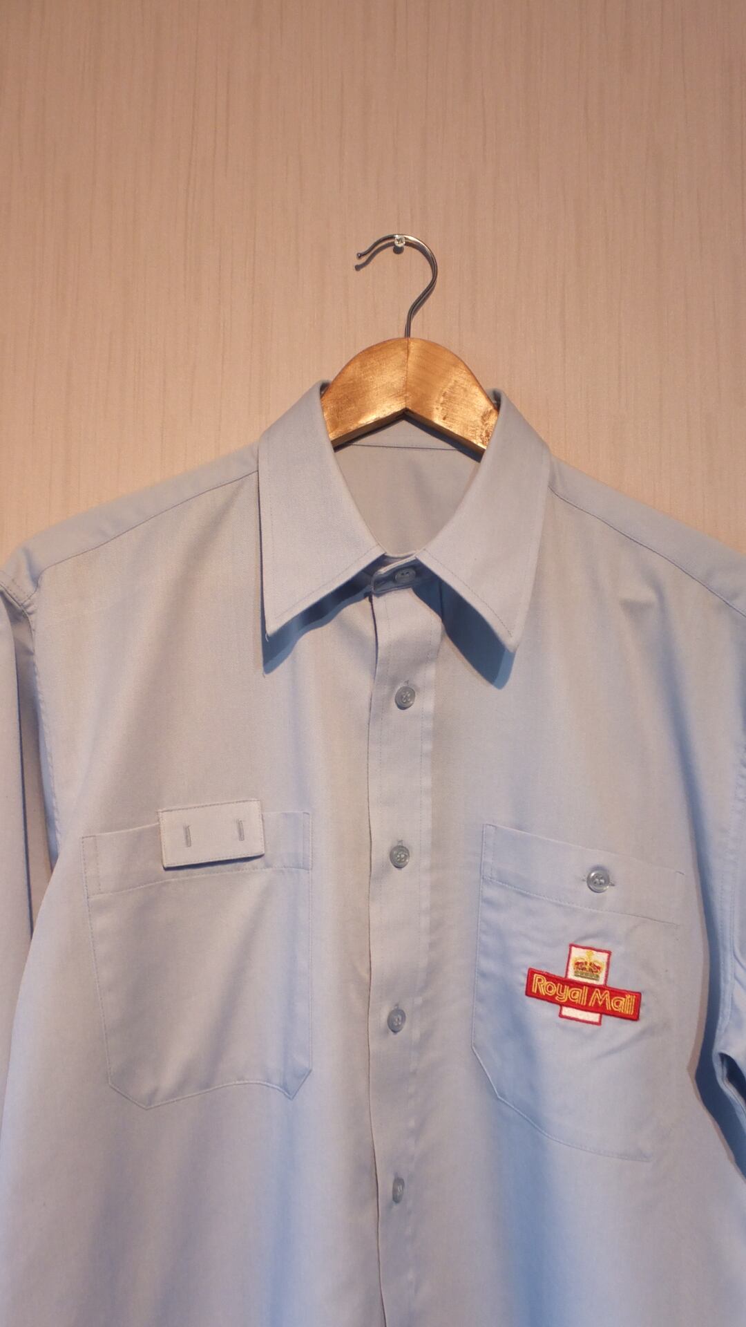 イギリスの郵便 ロイヤルメール Royal Mail 刺繍ロゴ入り 長袖シャツ 水色 サイズ表示S 日本サイズ概ねM相当 作業着 企業物古着
