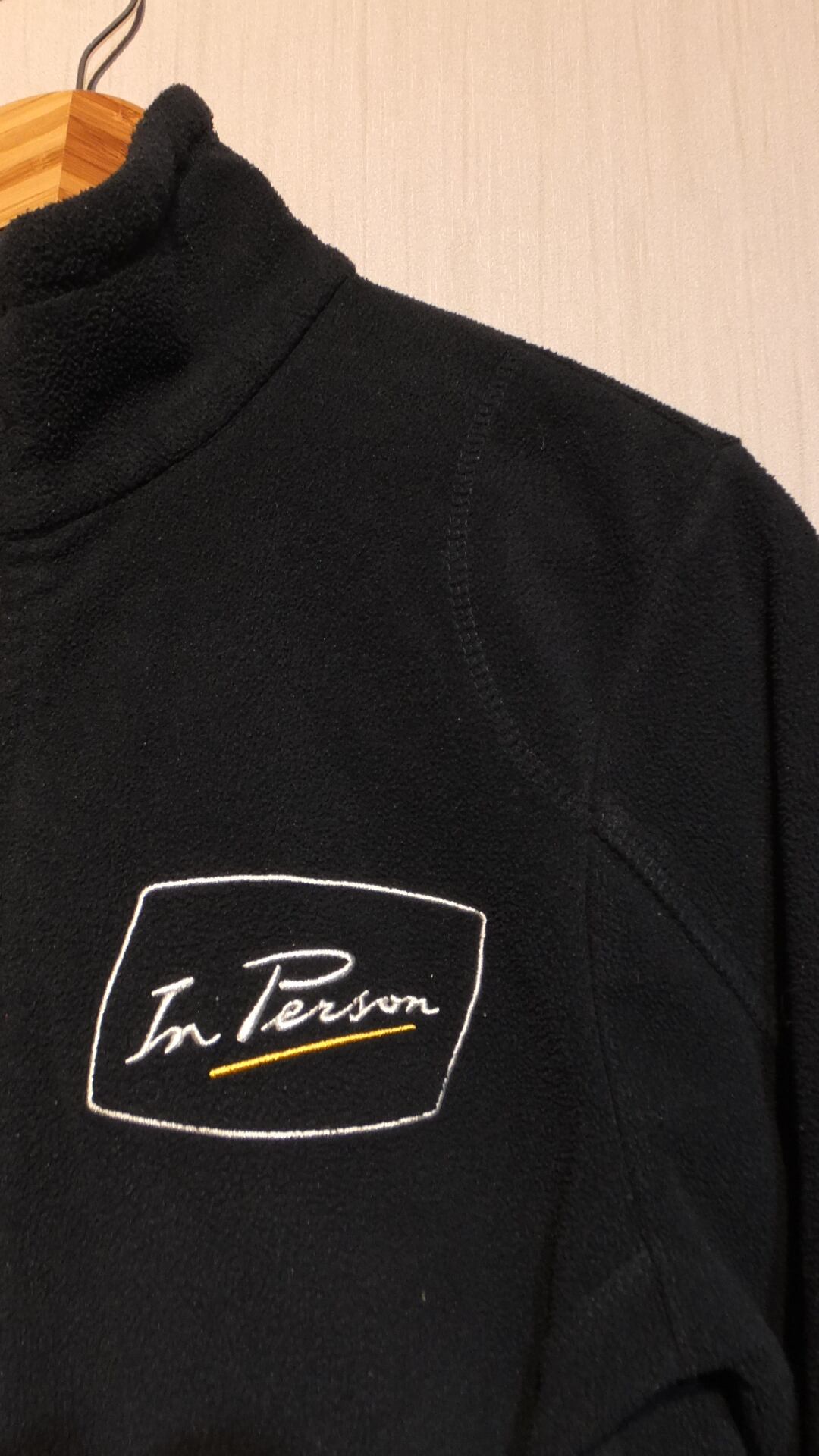 向かって右側と背面上部には、"In Person (本人が実際に、位の意)" という、会社のスローガンのようなものが刺繍されていることから、おそらく従業員や関係者が着用するものと思われます。
