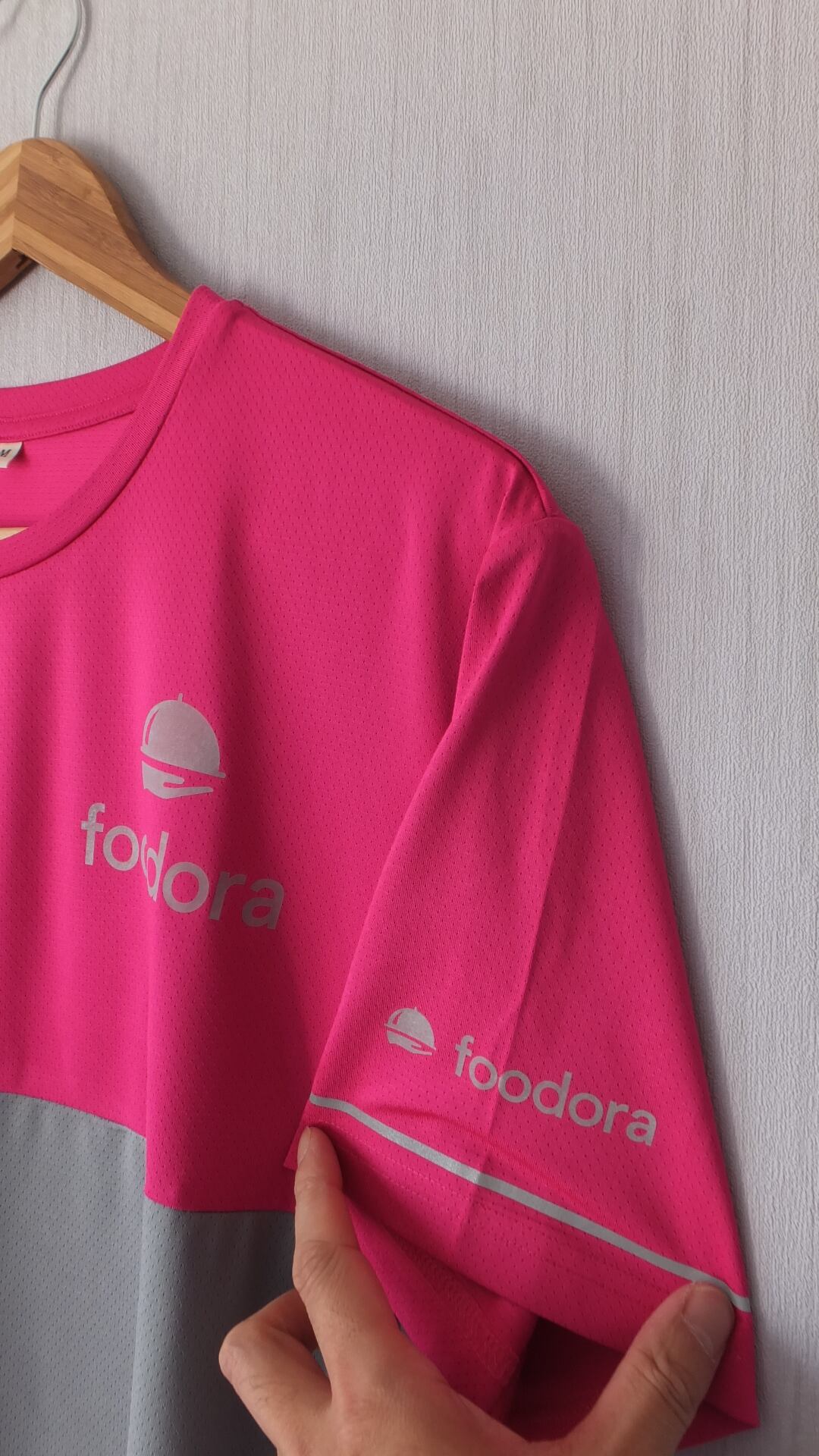 2021年現在、フィンランド、ノルウェー、スウェーデンの北欧三か国にて操業中のフードデリバリー業者、Foodora フードラ のロゴ入りTシャツです。