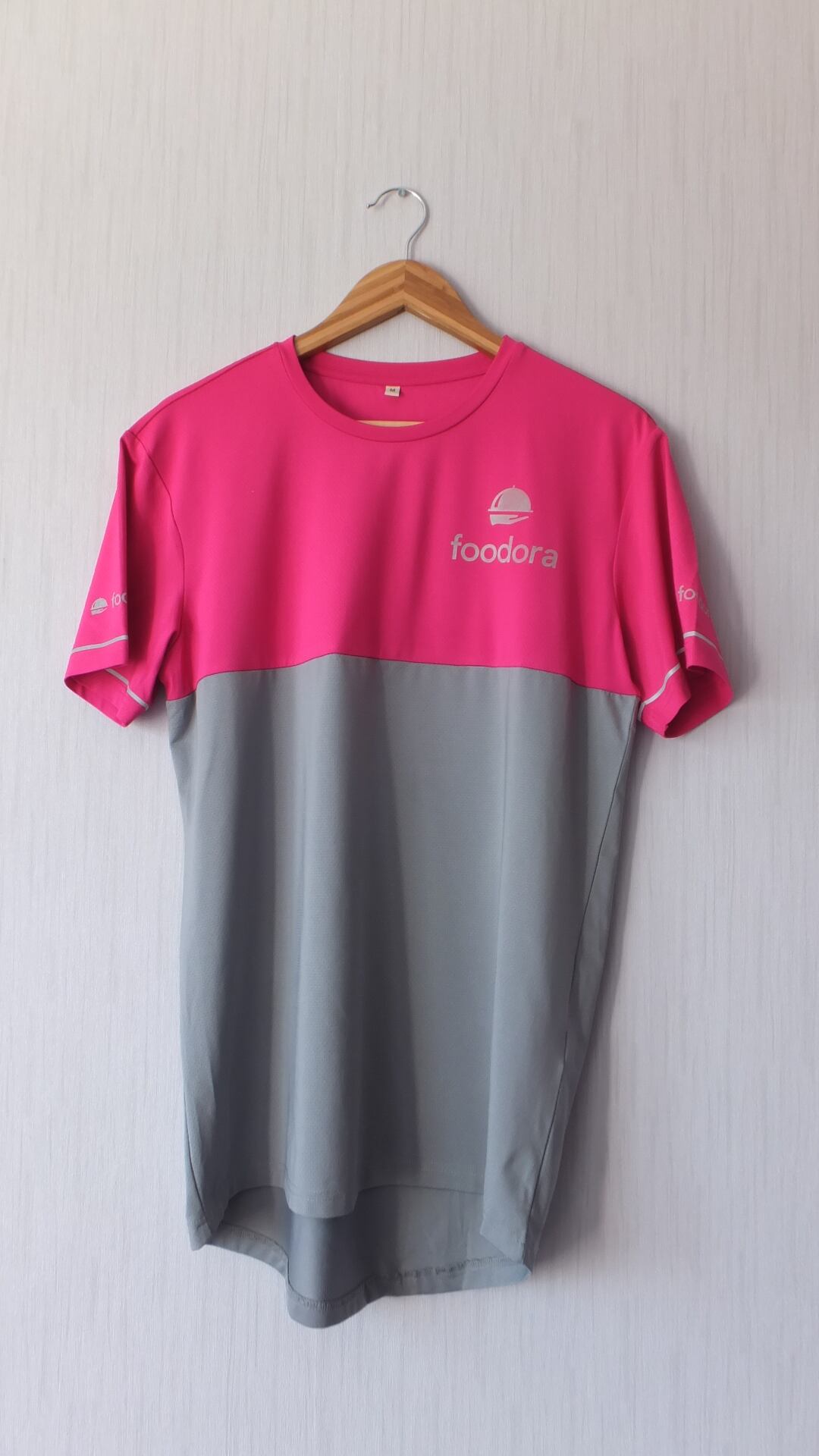 ★★50% OFF★★ 北欧のフードデリバリー業者 フードラ Foodora ロゴ3か所入りTシャツ ピンク/グレー 表示サイズM 日本サイズ概ねL以上相当(男女兼用サイズ基準)企業物古着