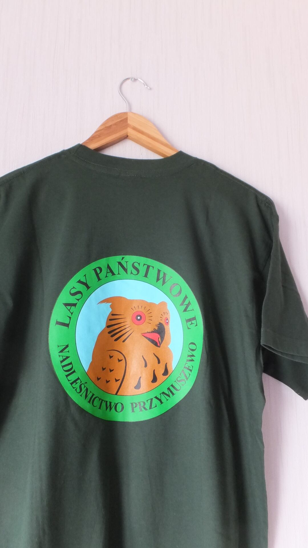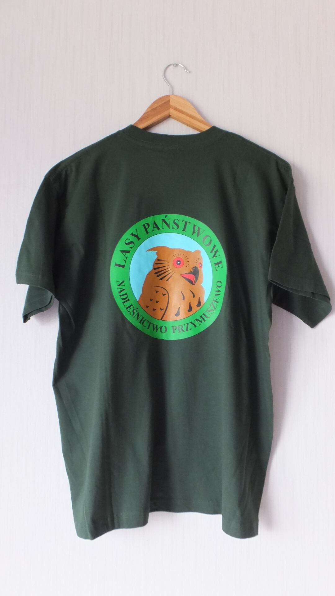 未使用新品 ポーランドの国有林 森林官(Przymuszewo プシムシェヴォ森林地区)両面プリント入り Tシャツ ダークグリーン 日本サイズ概ねL以上相当(男女兼用サイズ基準 身幅と肩幅広め)表示サイズL 公務員古着 ※写真1枚目はバックプリントです