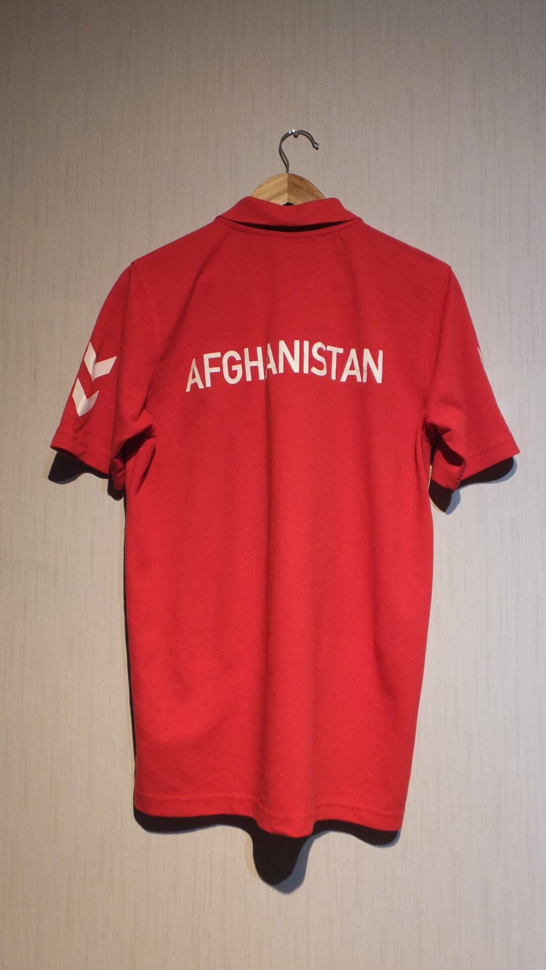 アフガニスタンサッカー連盟 連盟ロゴ、裏面国名プリント付き 半袖ポロシャツ 赤 hummel 日本基準概ねM相当(男女兼用サイズ基準) 表示サイズEU基準M、アジア基準S 組織系古着 | dankeman