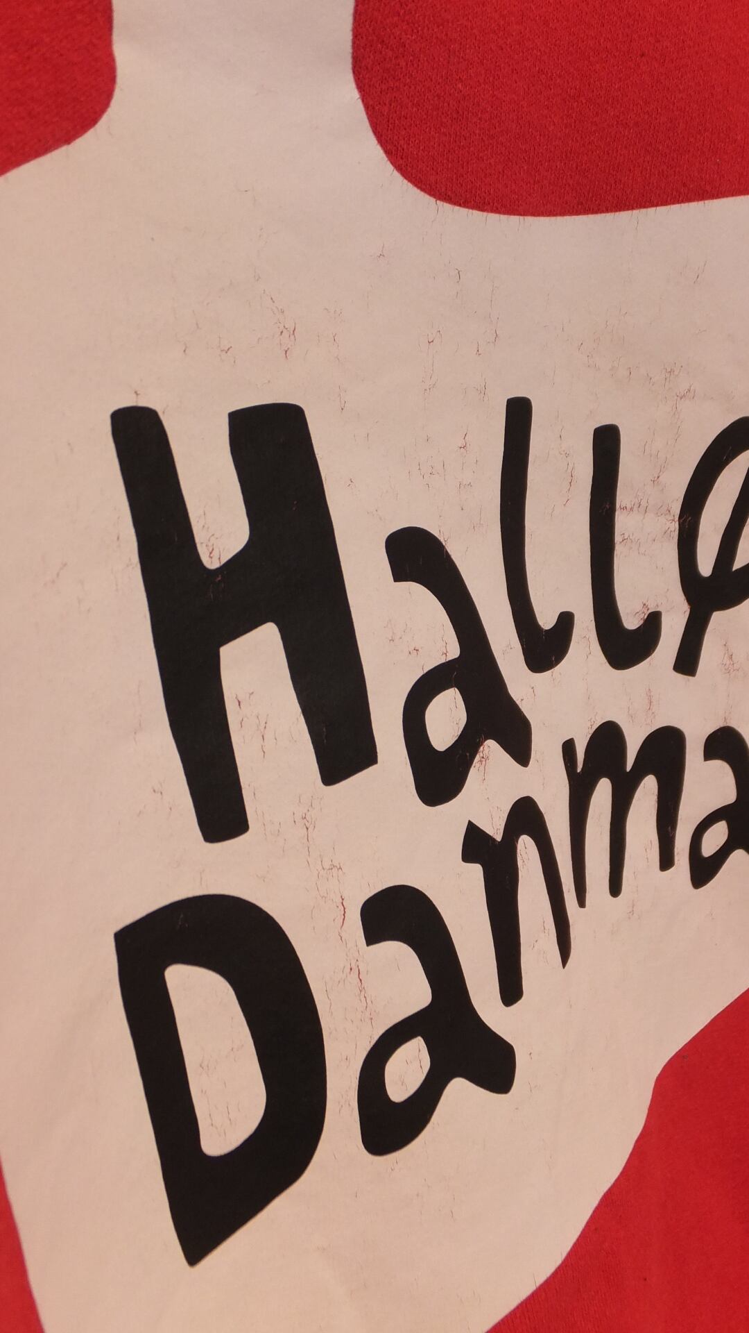 フライングタイガーは世界中に1000あまりの店舗を持っており、そこで働くスタッフの方は、裏面の Halløj (Hello) のあとに店舗のある地名(Shinjuku など)が入ったものを着用しております(そうでないところもあるかもしれませんが)。今回のスウェットはその地名のところに デンマーク が入っているところから、デンマーク国内のいずれかの店舗の従業員用と推察されます。