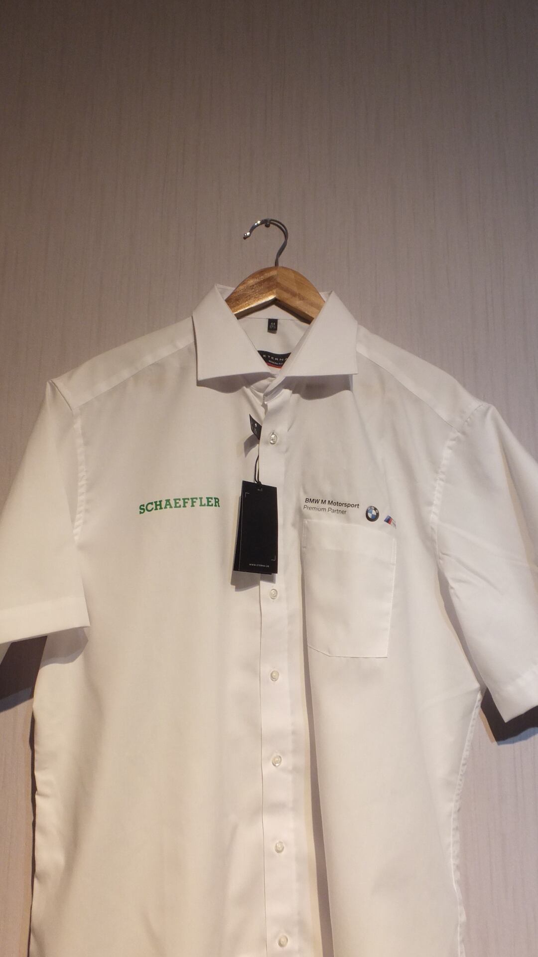 商品タグ、シール付き未使用品 ドイツの自動車、精密機械部品メーカー シェフラー SCHAEFFLER 両面ロゴプリント入り(BMVのロゴもあります)半袖シャツ ホワイト 日本基準概ねXL相当 表示サイズ44 企業物古着 | dankeman