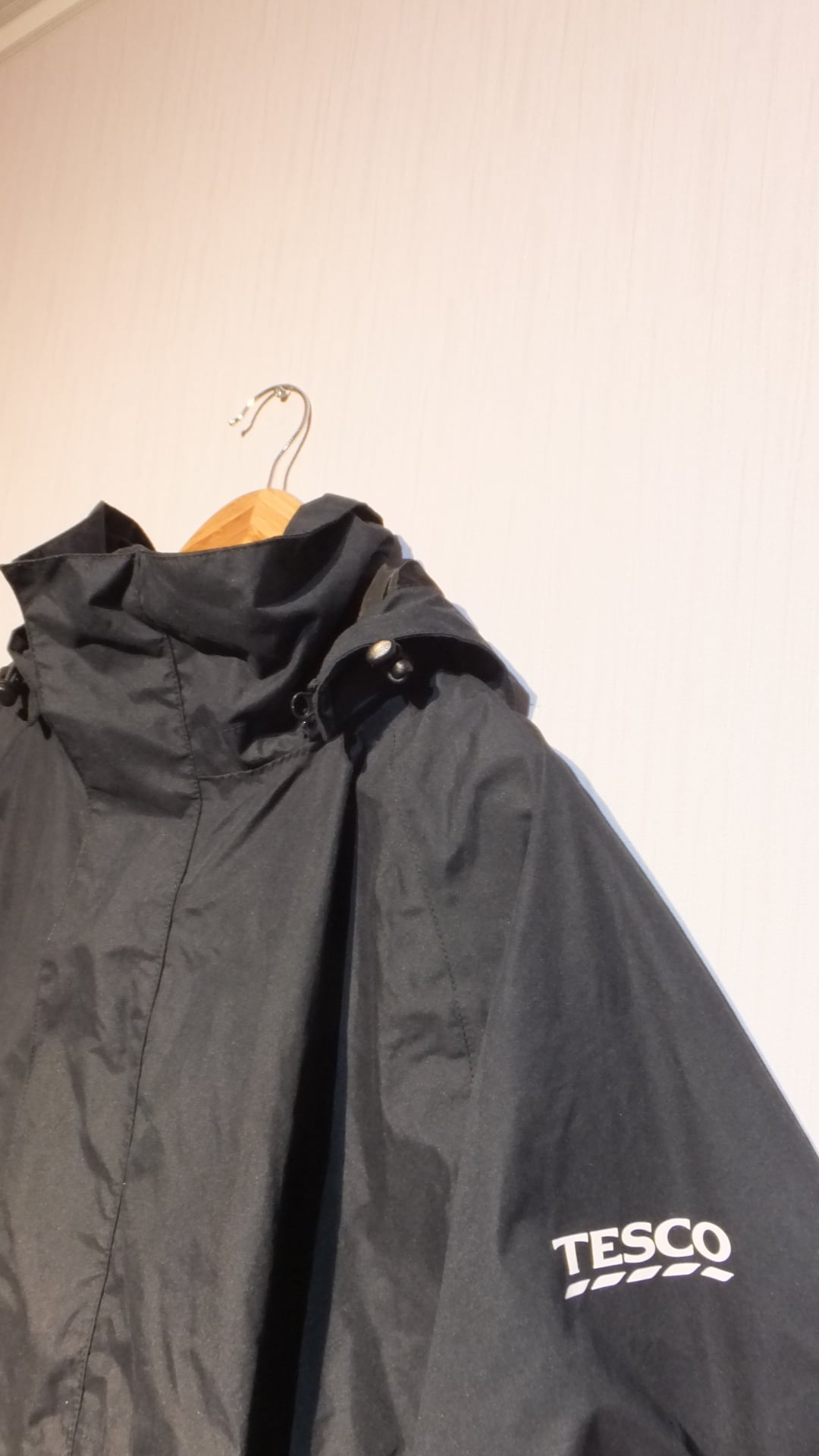 イギリスのスーパーマーケットチェーン TESCO テスコ 防水、通気機能付き従業員ジャケット ロゴプリント2か所入り フード着脱/収納可 ブラック 日本基準サイズ概ねメンズL相当 企業物古着 | dankeman