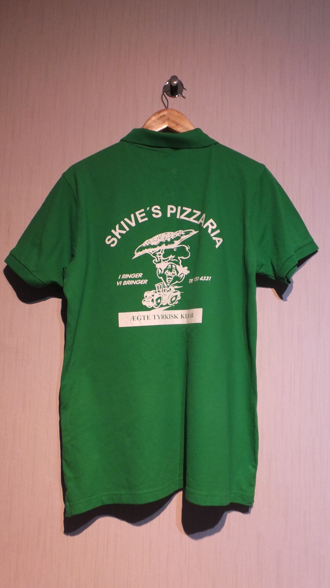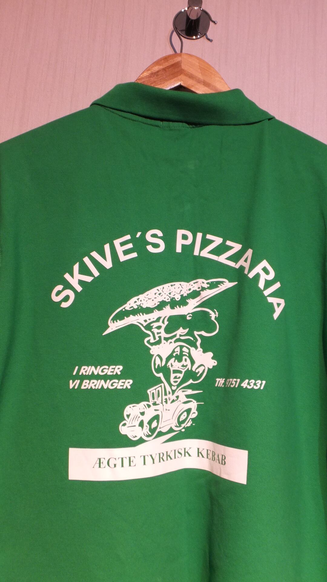 このピザ/ケバブ屋はチェーン店ではなく個人経営(スカイブさん)の模様。コペンハーゲンに一店舗のみです。電話番号も入っており、従業員の方向けの作業着と見てよいでしょう。