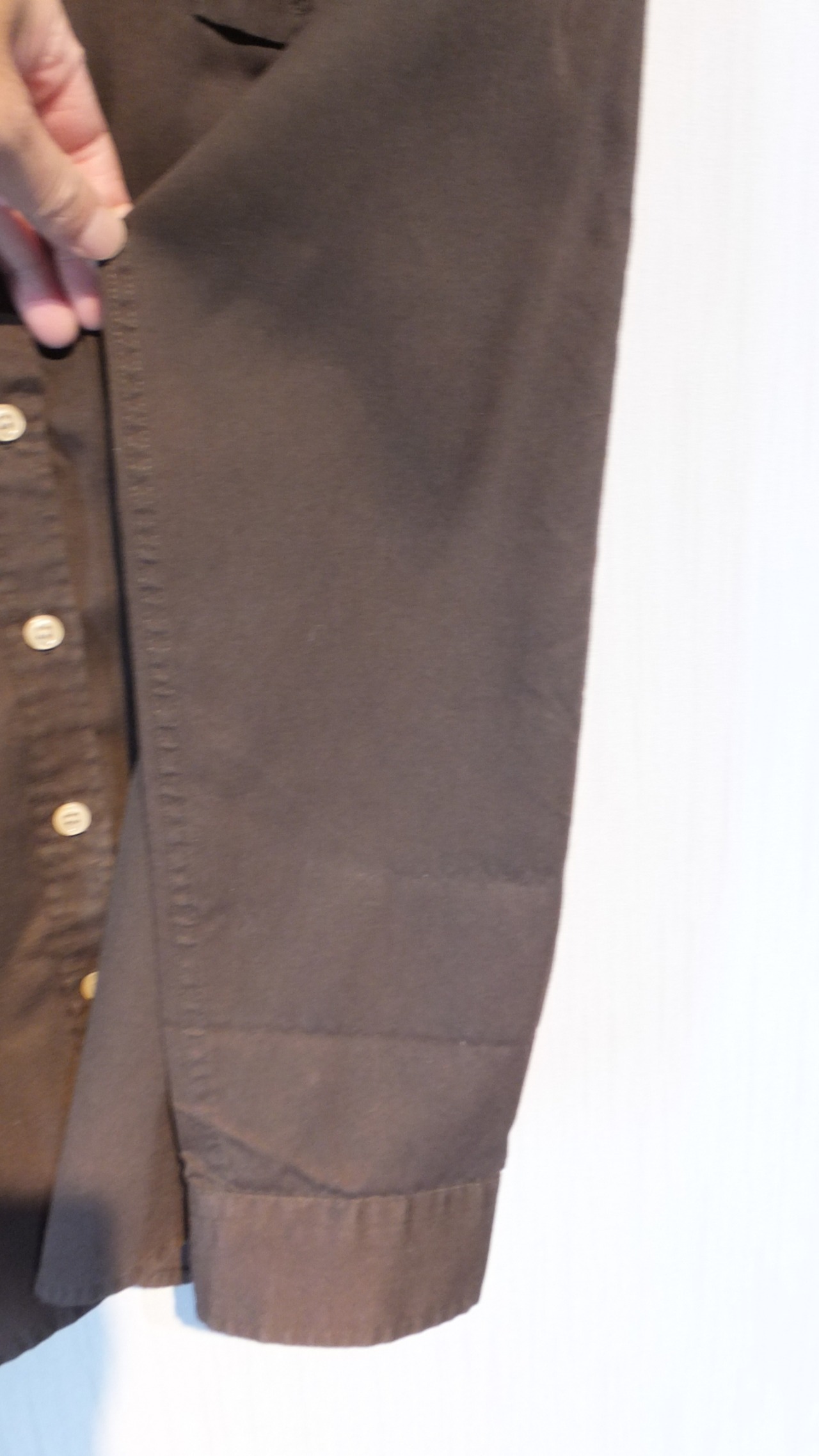 寸法: 着丈: 63 cm(ユニクロのスーピマコットンストレッチスキッパーシャツ 長袖 Mサイズとの比較値 - 2 cm)、身幅: 49 cm(同比較値 + 2 cm)、肩幅: 41.5 cm (同比較値 + 3.5 cm)、袖丈: 60 cm(同比較値 + 1.5)