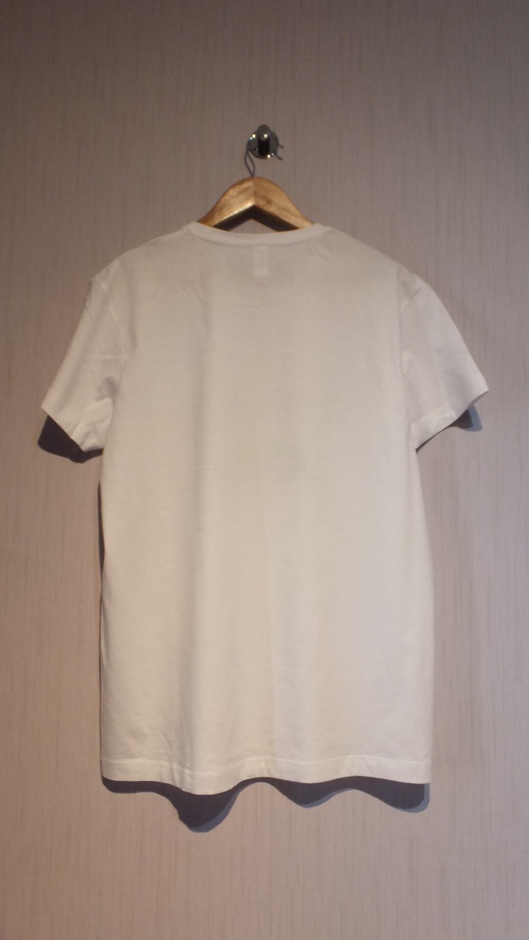 寸法: 着丈: 70 cm(ユニクロのTシャツLサイズとの比較値 ± 0 cm)、身幅: 54 cm(同比較値 + 1.5 cm)、肩幅: 46.5 cm(同比較値 + 2.5 cm)、袖丈: 18.5 cm(同比較値 - 3.5 cm)