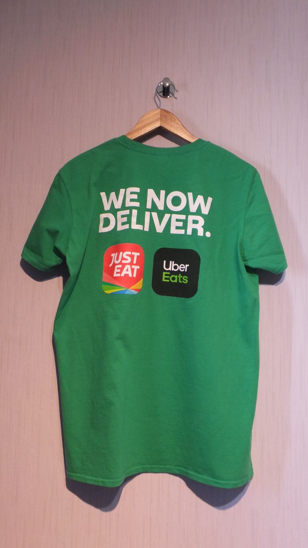 オンライン配達で近年あまりにも有名となった、Uber Eats ウーバーイーツと、主にヨーロッパで事業を展開中の、同じくオンライン注文プラットフォーム JUSTEAT ジャストイート 両方のロゴがプリントされたTシャツです。