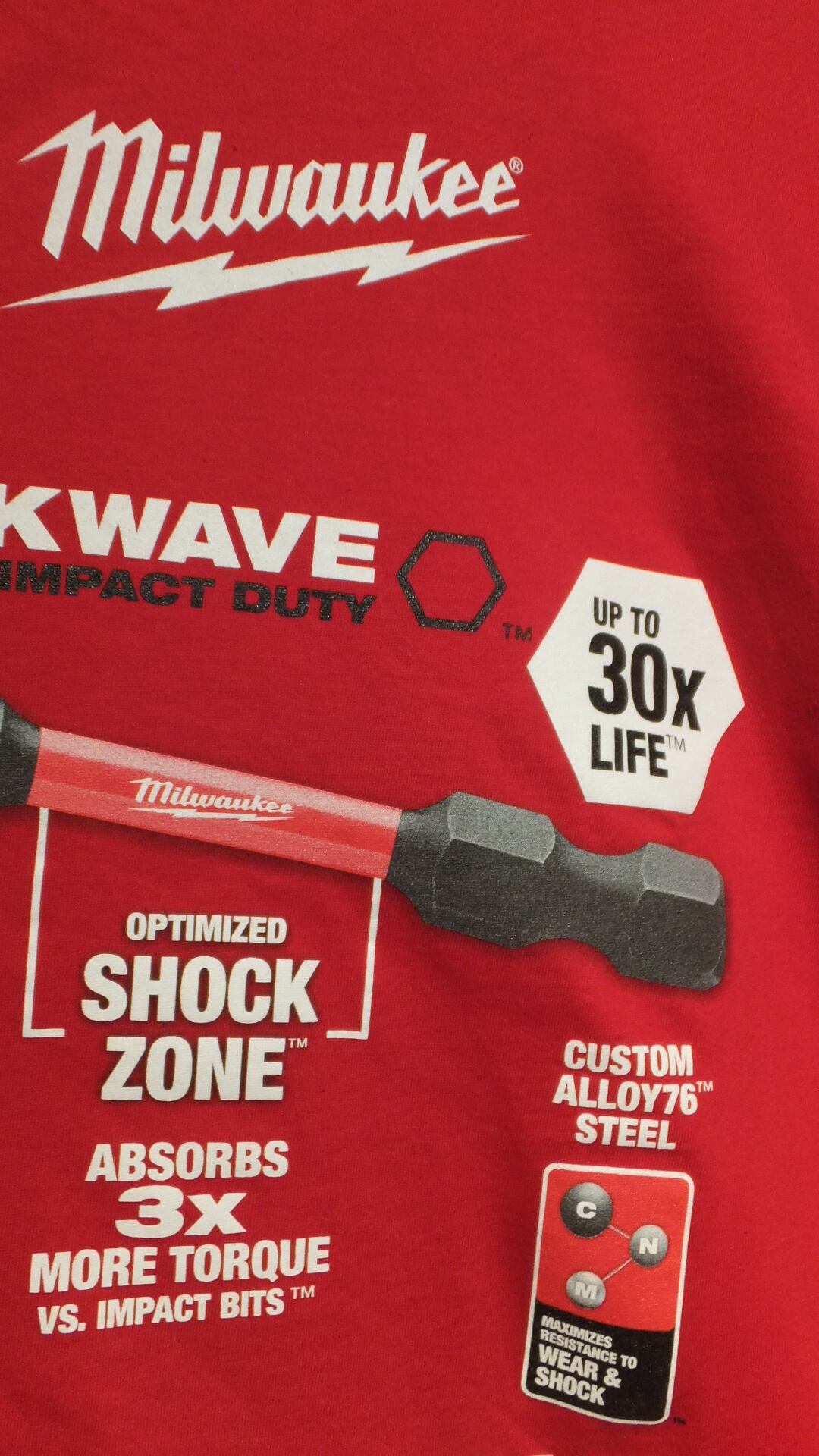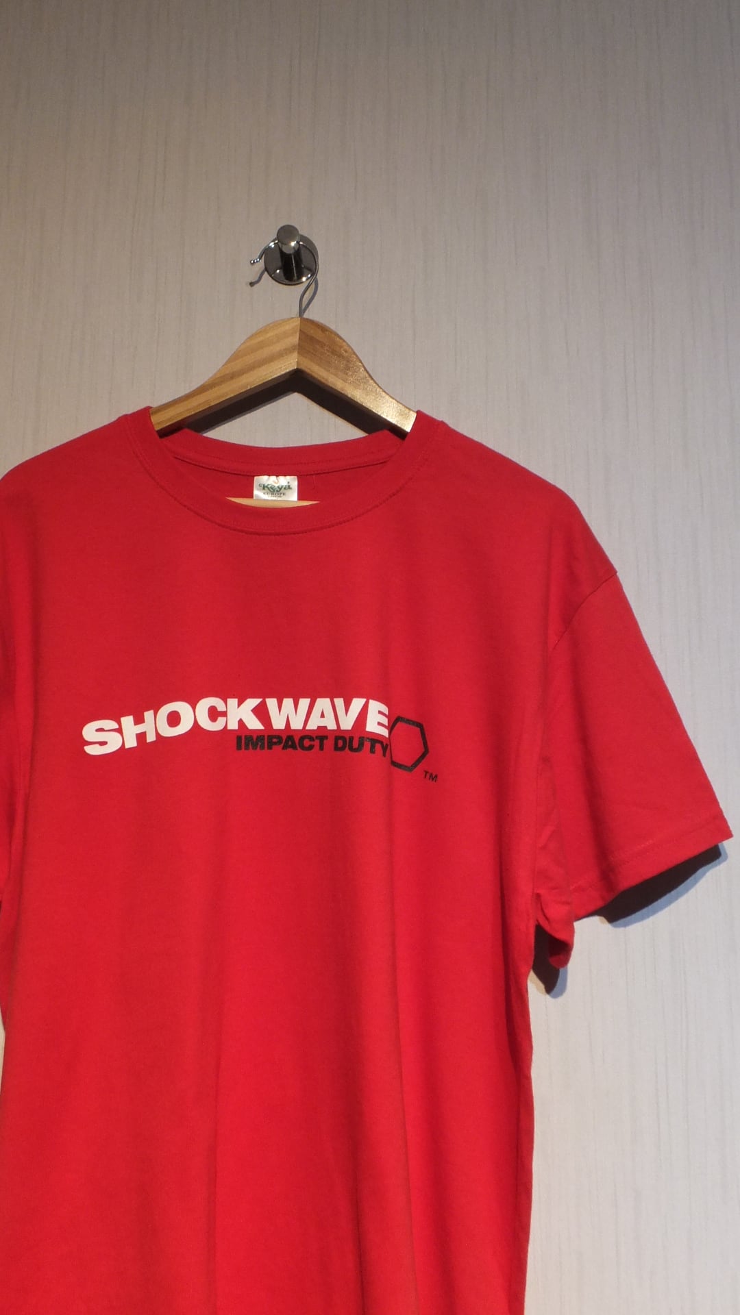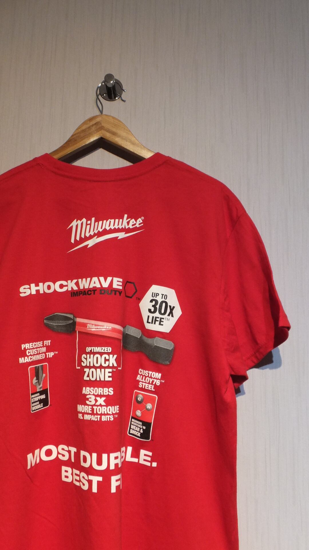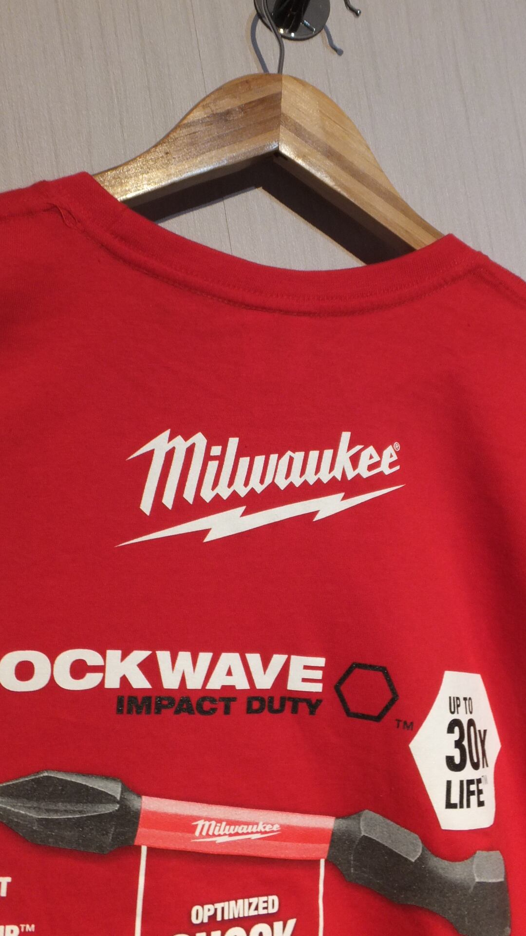 シール付き未使用新品 アメリカの建設工具メーカー ミルウォーキー Milwaukee(SHOCKWAVE IMPACT DUTY) 両面プリント入りTシャツ レッド 日本サイズ概ねXL相当(男女兼用サイズ基準)表示サイズXL 企業物古着 ※写真1枚目はバックプリントです | dankeman