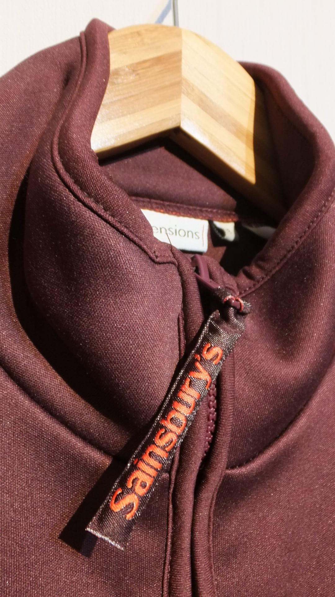 イギリスのスーパーマーケットチェーン セインズベリーズ Sainsbury's スタッフ用企業ロゴ入り フルジップフリーススウェット 臙脂 日本基準サイズ概ねメンズS相当 サイズ表示12 企業物古着 作業着