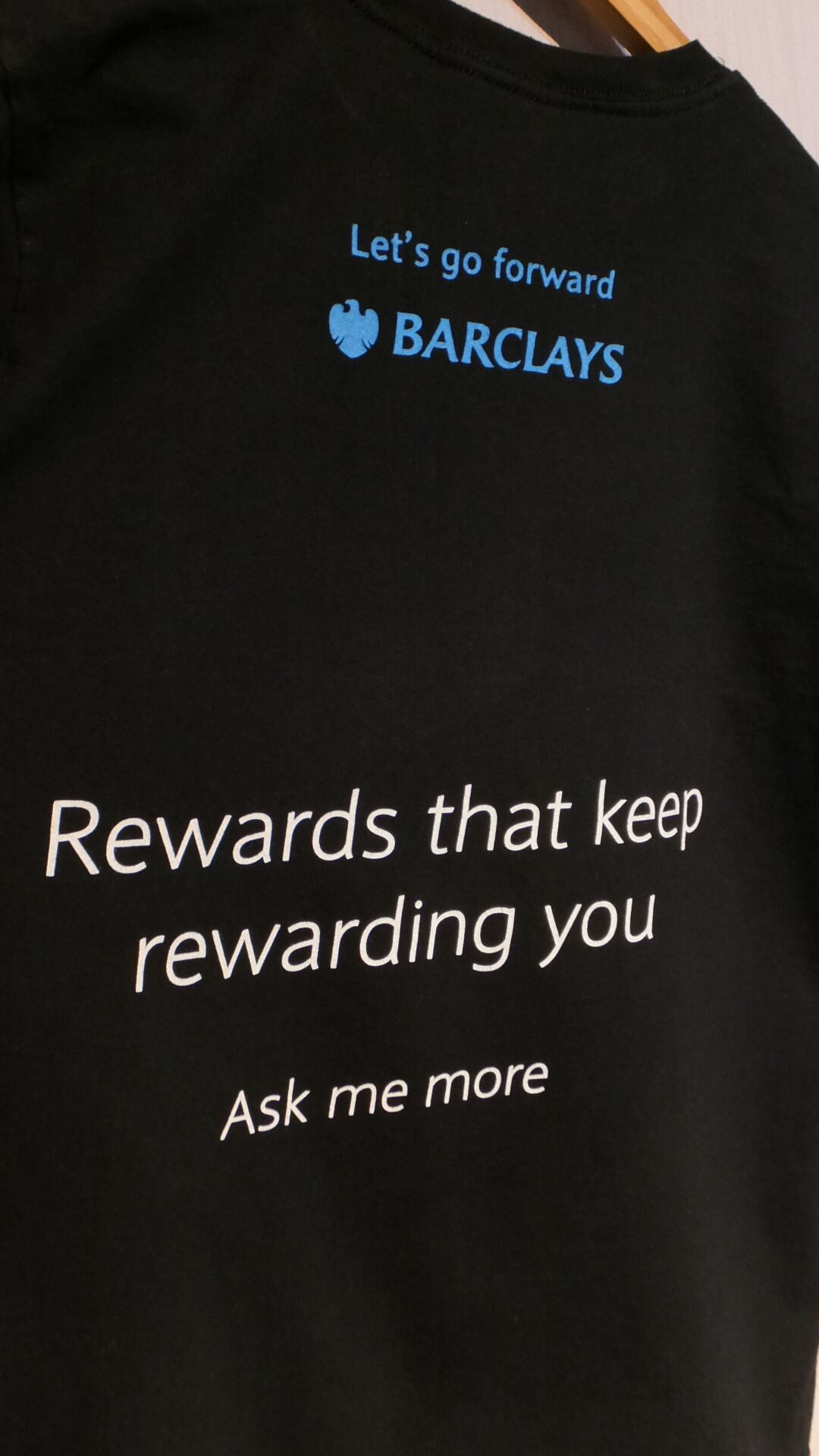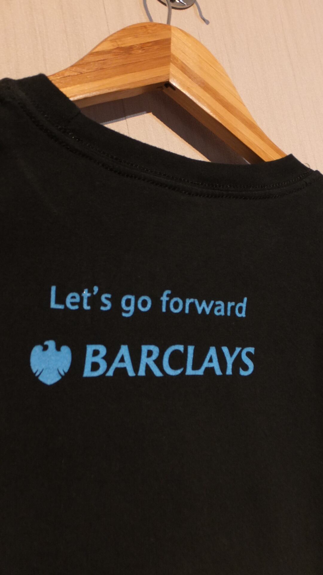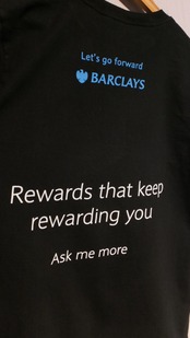 泣く子も黙るイギリス本部の世界的金融グループ、バークレイズ BARCLAYS の、おそらく顧客担当者用Tシャツです。