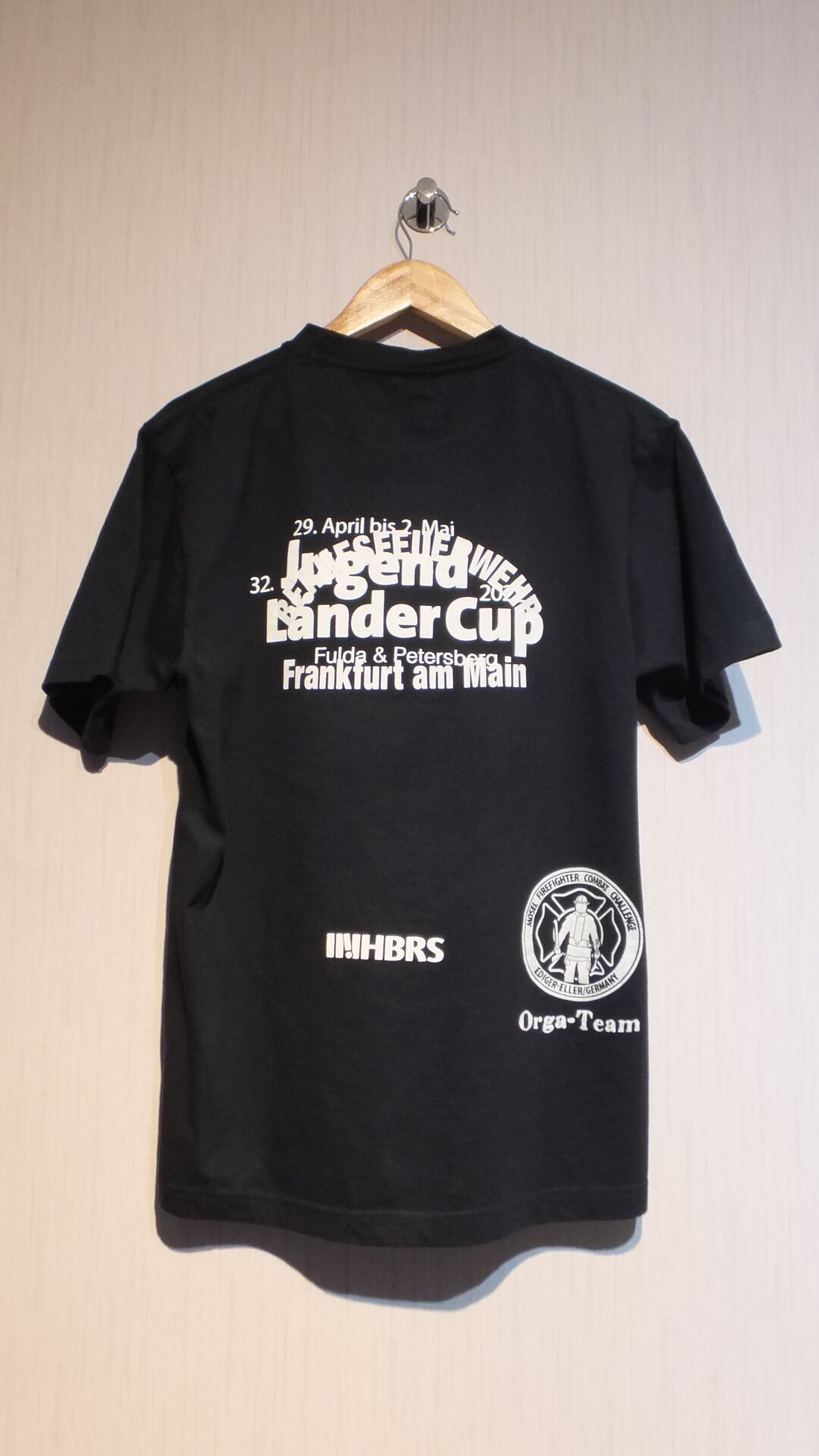 表面、胸のあたりにフランクフルトの消防隊のロゴが確認できます。その他多数のテキストが確認できますが、一般単語とイベントの協賛企業と見られます(多数の為すべてを調査してはおりません、ご了承ください)。また、プリントを重ねているのはデザイン上のものと思われます。