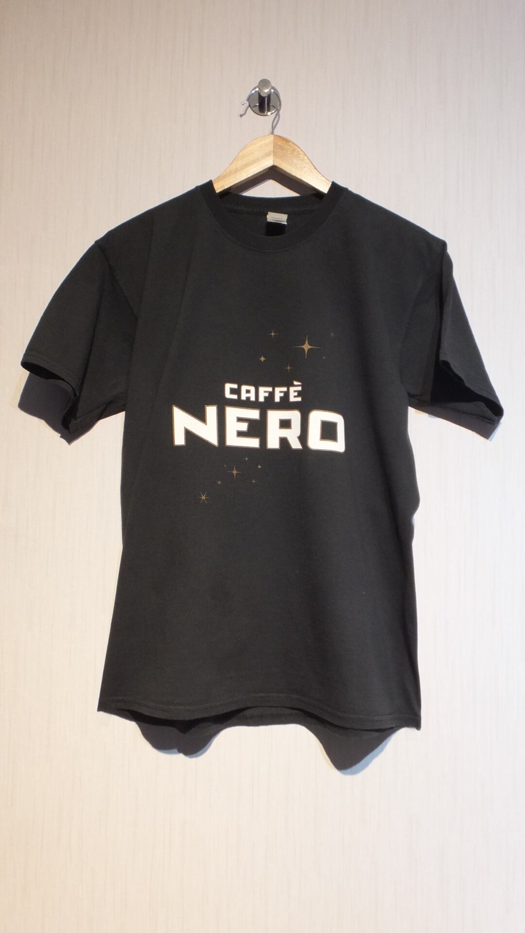 本格イタリアンコーヒーに定評、イギリス発祥のカフェチェーン Caffè Nero カフェ・ネロ のロゴ入りTシャツです。カフェ・ネロは主にイギリスでビジネスを展開中ですが、ヨーロッパ内で5か国、中東地域2か国、アメリカ合衆国にも出店中の模様。全世界に1000店舗の店舗数を擁します(2019年時点)。