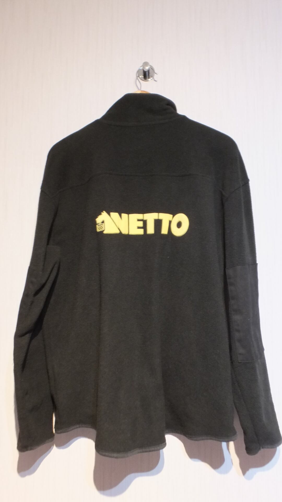 デンマーク発祥のスーパーマーケット NETTO 両面ブランドロゴ(刺繍、パッチ)入り フルジップフリーススウェット ブラック 日本基準サイズ概ねL以上相当(肩幅広め) サイズ表示L 企業物古着 作業着