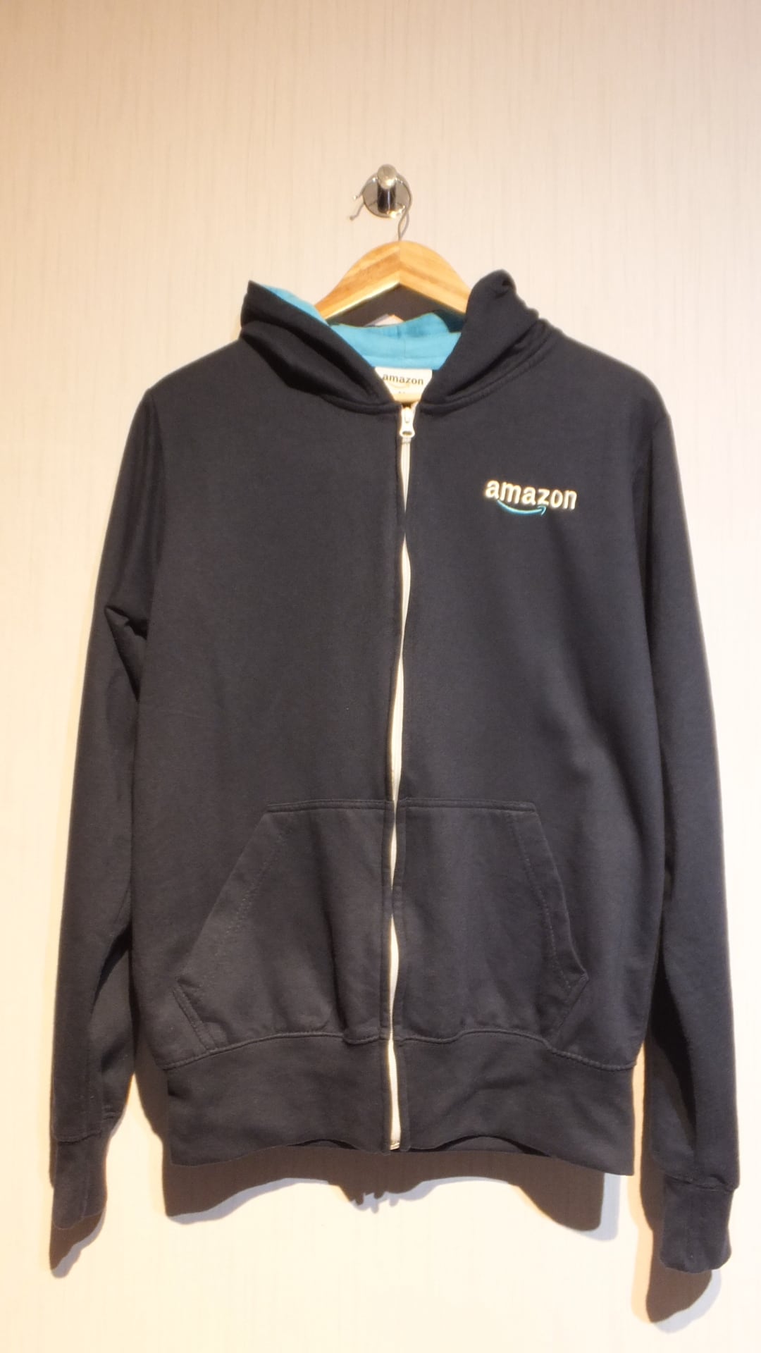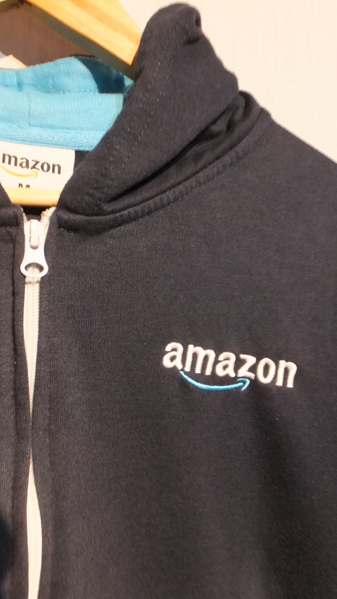 言わずと知れたオンラインショッピングサイト界のゴッドファーザー、且つビッグブラザー Amazon アマゾン の会社ロゴ刺繍入りパーカーです。おそらく従業員の方の業務用ではないかと見られます。
