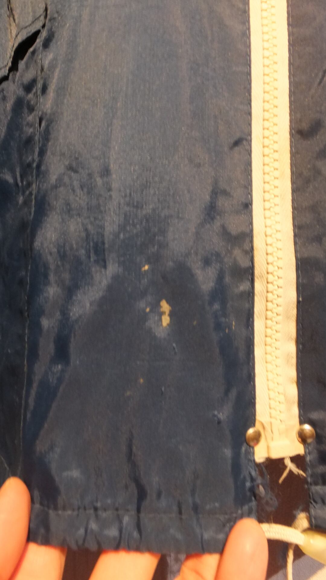 表面下部ファスナー付近、ビニールのような素材の付着跡が数か所確認できます。